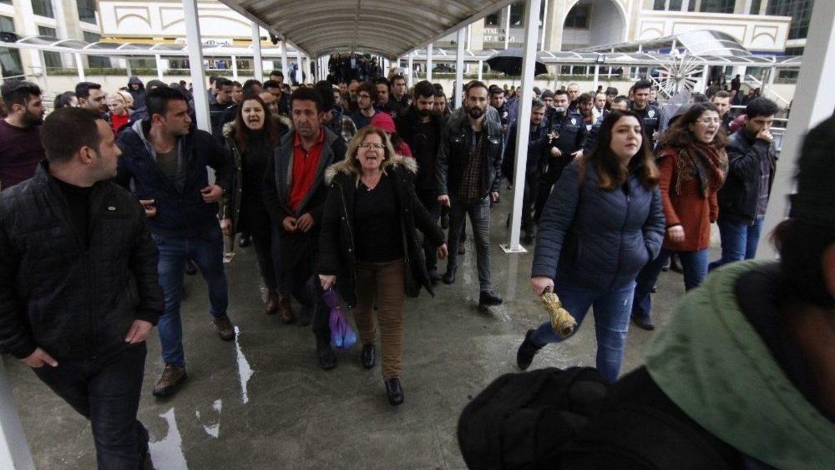 Antalya Adliyesi dışında açıklama yapmak isteyen gruba polis müdahale etti.Antalya’da Türk Silahlı Kuvvetlerince (TSK), terör örgütleri PYD/PKK ve DEAŞ’a karşı yürütülen "Zeytin Dalı Harekatı" aleyhinde sosyal medyada paylaşımı ve "Cumhurbaşkanına hakaret" ettikleri iddiasıyla 13 Şubat’ta 4 kişi gözaltına alınmıştı. Emniyetteki sorguları tamamlanan Halkevleri MYK üyesi K.M., Antalya Halkevi üyesi Y.T., DİSK/Gıda-İş Antalya Şube yöneticisi M.A. ve S.B. emniyetteki sorgularının ardından adliye sevk edildi. K.M. ve S.B. tutuklanarak cezaevine gönderilirken Y.T. ve M. A. ise adli kontrol kararıyla serbest bırakıldı. Kararın açıklanmasının ardından K.M. ve diğer şüphelileri desteklemeye gelen grup ile polis arasında adliye koridorlarında kısa süreli gerginlik yaşandı. Polisin müdahalesi ile adliye dışına çıkartılan grup üyeleri, Meltem 1’inci Cadde üzerinde basın açıklaması yapmak istedi. Basın açıklamasına izin verilmezken bölgeden uzaklaştırılmak istenen grup üyelerinden bir kısmı ana caddeye çıkarak araç trafiğini kesip slogan atmaya başladı. Tüm uyarılara rağmen grup üyeleri dağılmayınca polis ve Çevik Kuvvet ekipleri müdahale ederek 9 kişiyi gözaltına aldı. Gözaltına alınan 9 kişi ifadelerinin alınması için Emniyet Müdürlüğüne götürüldü.