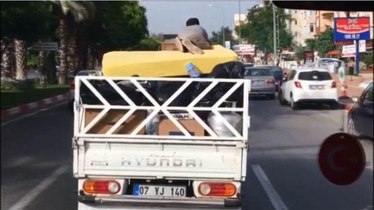 Antalya’da şehrin merkezindeki yoğun trafikte vatandaşlar tarafından kaydedilen ilginç yolculuk yöntemi görenleri hayrete düşürdü.Antalya’nın Konyaaltı İlçesi Atatürk Bulvarı üzerinde dün öğlen saatlerinde vatandaşlar trafikte ilginç bir görüntü ile karşılaştı. Vatandaşlar, yoğun trafik arasında 07 YJ 140 plakalı beyaz bir kamyonetin üstünde bulunan bir yatağın üzerine uzanarak yolculuk yapan bir kişiyi görünce şaşkınlık yaşadı. Ev eşyaları taşıdığı gözlenen kamyonetin üzerinde yüz üstü uzanarak konforlu, bir o kadar da tehlikeli bir yolculuk yapan kişi, kimseye aldırış etmeden yolculuğuna devam etti.Vatandaşlar konforu ve tehlikesi bir arada olan bu yolculuk için ‘güneşleniyor’, ‘ölümle dans ediyor’, ‘rüzgar olursa adam da uçacak’ yorumunda bulundu. Cep telefonuyla bu ilginç yolculuğu kaydeden vatandaşların ‘kolay gelsin’ sözüne de el sallayıp gülerek karşılık veren adamın, aşağı düşmemek için yatağa sıkıca sarıldığı da gözlerden kaçmadı.