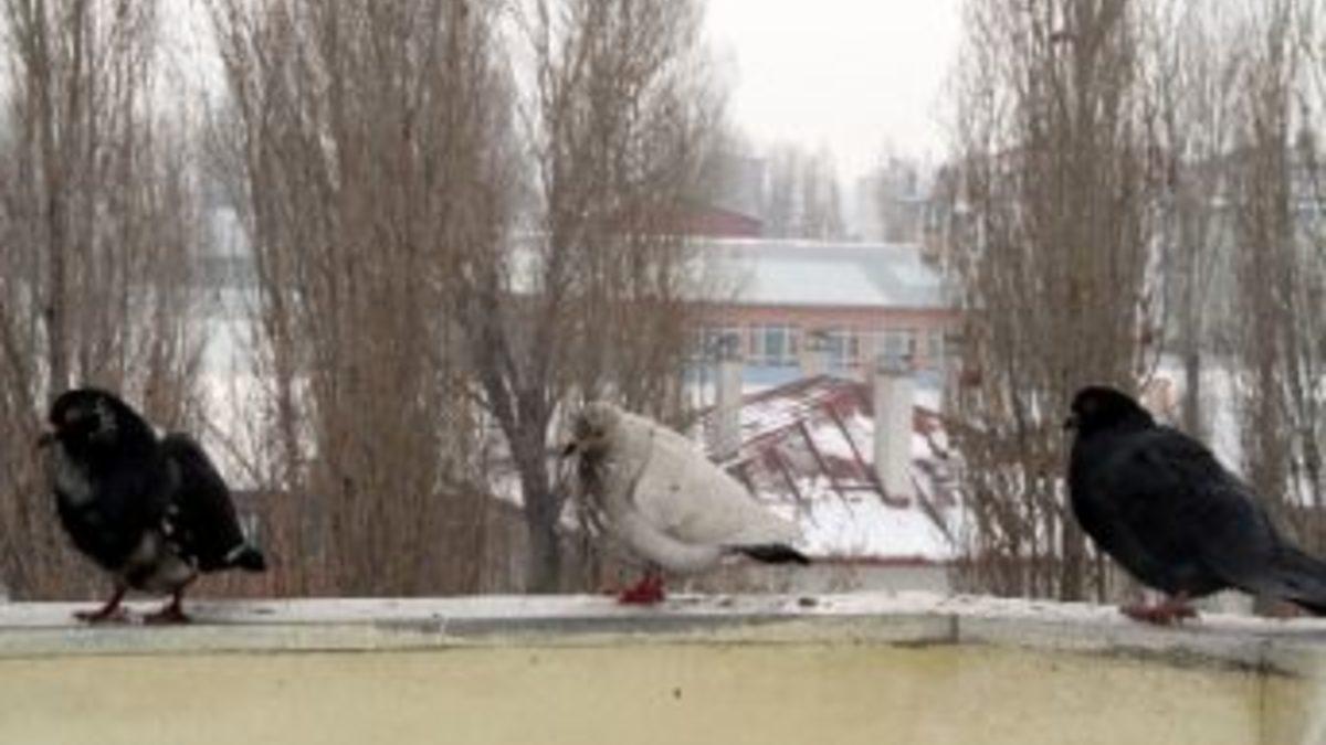 Ardahan'da, soğuk havadan etkilenen güvercinler kondukları binanın balkonunda ilginç görüntü oluşturdular