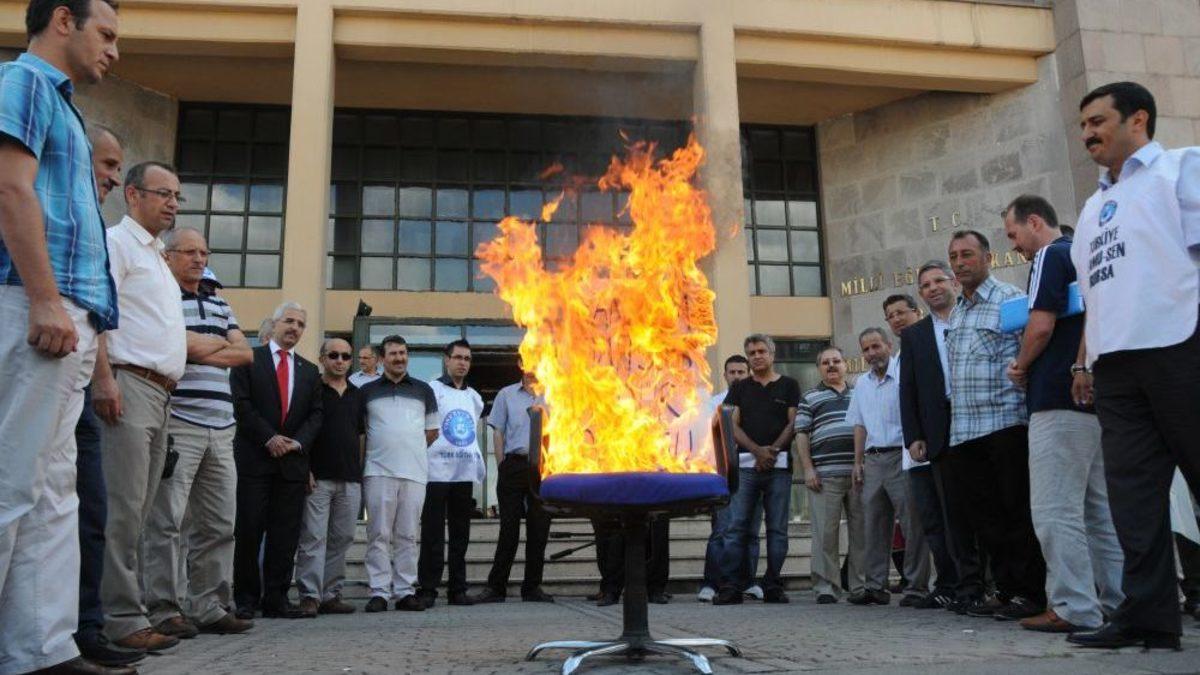 Bursa’da bir grup eğitimci, okul müdür atamalarına tepki göstermek amacıyla İl Milli Eğitim Müdürlüğü önünde okul müdürü koltuğu yaktı. Türk Eğitim-Sen üyesi öğretmenler, atamaların hukuksuz olduğunu öne sürdü. Öğle saatlerinde Bursa Milli Eğitim Müdürlüğü önünde toplanan Türk Eğitim-Sen üyesi bir grup öğretmen, geçtiğimiz günlerde gerçekleştirilen okul müdür sınavına yönelik tepkilerini dile getirdi. Türk Eğitim-Sen Bursa 2 Nolu Şube Başkanı Selçuk Türkoğlu, "Okul müdürü mülakatında 90 ve üzeri puan alanların yüzde 95’i yandaş sendika mensupları. Yazılı sınav kazanıp mülakata giren 214 idareci adayından 90 ve üzeri en yüksek puan verilen 75 adaydan 71’i yandaş sendika mensubudur. Mülakatlar tam bir komedidir. 214 aday 3 gün içerisinde ortalama 2,5 dakikalık mülakat sonucu puanlandırılmıştır. 2,5 dakikada kabak bile seçilmez. Sizin dışınızdakilerin yaşama şansı olmayacak, niye? Sizin dışındakiler eğitimci değil mi? Kime ne yapmışlar? Hangisi yeterli değil. İşgal etmek için her şeyi feda ettiğiniz bu koltuklara tamaH edecek ucuzlukta arkadaşlara sahip değiliz." dedi.Yanlarında getirdikleri ve üzerinde 'Yandaşa mahsus müdür koltuğu' yazan koltuğu yakarak milli eğitim müdürlüğüne iade edeceklerini belirten Türkoğlu şunları kaydetti: "Bu koltuğu size yakarak iade edeceğiz. Bu mülakatın da, yönetmeliğin hukuki zeminde peşini bırakmayacağız. Tüm arkadaşlarımız mülakat sonuçlarına itiraz edecek ve ardından mahkeme sürecini başlatacağız." Konuşmanın ardından Türkoğlu, yanlarında getirdikleri koltuğu benzin dökerek ateşe verdi. Kısa sürede alevlerin sardığı koltuğa Bursa Milli Eğitim Müdürlüğü çalışanları yangın söndürme tüpüyle müdahale etti. Koltuk, kullanılAmaz hale geldi.