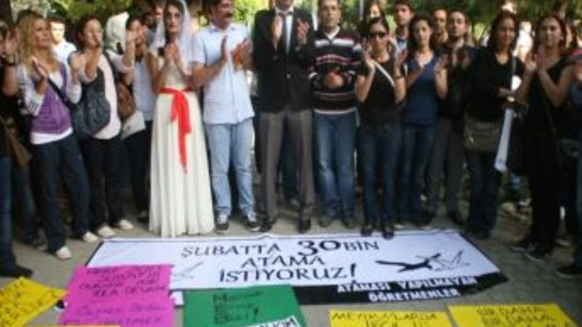 Burada yapılan eylemde, en çok ilgiyi ‘gelin’ ve ‘damat’ kılığına giren atanamayan öğretmenler çekti. Fen ve Teknoloji bölümünden mezun olmasına rağmen 2 yıldır atanamayan Rıdvan Aslan ‘damat’ kılığına girip ‘iş, eş, 3 çocuk istiyorum’ dövizi taşırken, ‘gelin’ kılığına giren 3 yıldır atanamayan Türkçe öğretmeni Özlem Burhan da ‘ölmek değil, öğretmen olmak istiyorum’ dövizi taşıdı. Temsili eş rolünü oynayan öğretmen adaylarının yanında ise ‘anne bekle birlikte atanırız’ dövizi taşıyan bir çocuk da yer aldı.