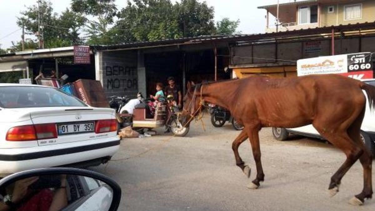 Murat KİBRİTOĞLU/ ADANA, Merkez Yüreğir İlçesi'ndeki Karataş Bulvarı üzerinde 01 DY 350 plakalı otomobilin arkasına iple bağlanan at, bir süre trafikte bu şekilde götürüldü. Yoğun trafik ve sıcak havada ilerleyen atı görenlerin 'Hayvana eziyet etme' diye uyarmalarına rağmen sürücü yoluna devam etti. Aracın hızlı olmaması nedeniyle çok fazla koşmak zorunda kalmayan at ile otomobil, tepkilere rağmen ara sokaklara girip gözden kayboldu.