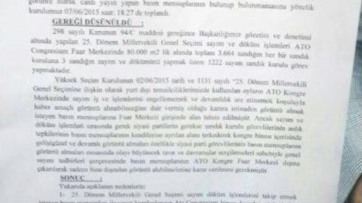 ATO Congresium’da yaşanan arbede sırasında kendilerine ayrılan alanı terk ederek arbedenin yaşandığı bölgeye gelen gazeteciler, alan ihlalinde bulundukları gerekçesiyle dışarı çıkartıldı.ATO Congresium’da oyların sayımı sırasında yaşanan arbede sırasında kendilerine ayrılan alanı terk ederek arbedenin yaşandığı bölgeye gelen gazeteciler, alan ihlalinde bulundukları gerekçesiyle dışarı çıkartıldı. Alınan hakim kararı gazetecilere iletilerek dışarı çıkartıldı.