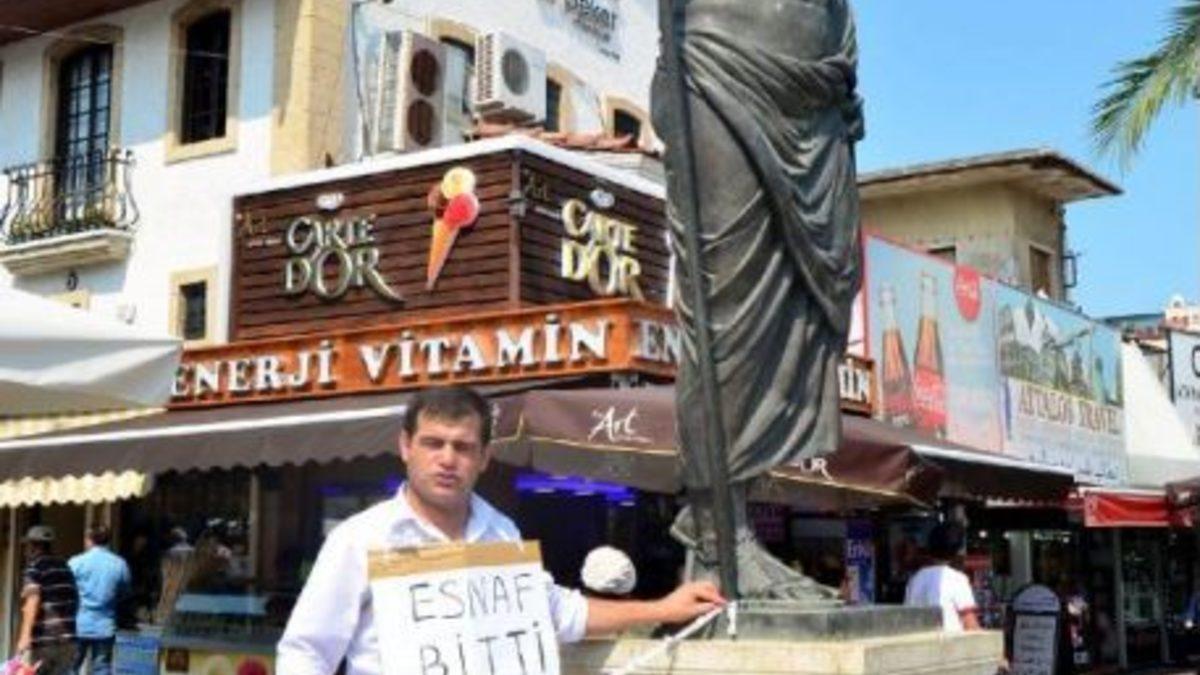 Mustafa KOZAK/ ANTALYA, Kalekapısı'ndaki Attalos Heykeli önünde tek başına saat 22.00'den sonra alkol satışını yasaklayan karara tepki için eylem yapan Mustafa Ertem, hükümetin izlediği politikalar yüzünden esnafın para kazanamadığını iddia etti. Yasada belirtilen saatten sonra alkollü içecek sattığı gerekçesiyle para cezası verildiğini kaydeden Ertem, bu nedenle işyerini devretmek durumunda kaldığını anlattı. Şu anda özel güvenlik görevlisi olarak çalıştığını kaydeden Ertem, "Ben mağdur oldum, başkaları olmasın diye eylem yapıyorum" dedi.