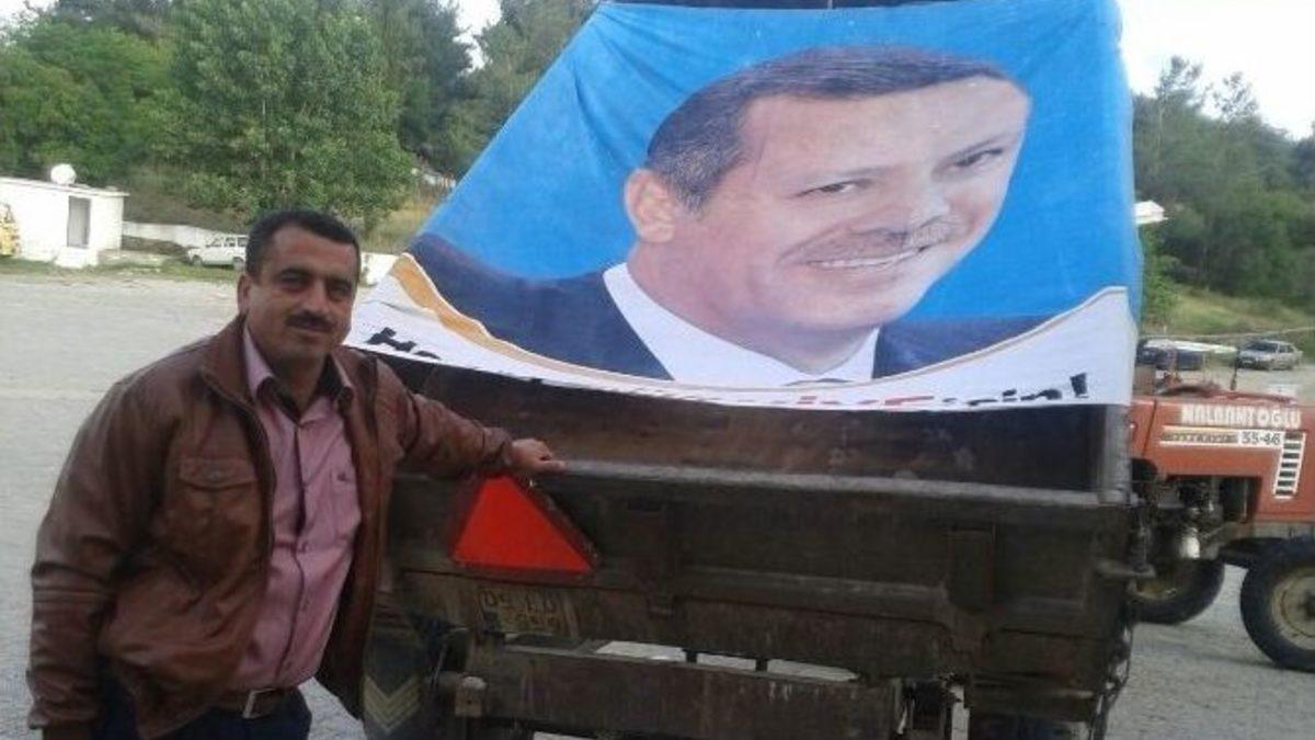 Aydın’ın Karpuzlu İlçesi’ne bağlı Tekeler Mahallesi’nde yaşayan bir vatandaşın Cumhurbaşkanı Recep Tayyip Erdoğan sevdası görenleri şaşırtıyor.Cumhurbaşkanı Erdoğan’ın dev pankartını traktörünün römorkuna gerdirerek köy köy dolaşan vatandaş, hem reklam yapıyor hem de Cumhurbaşkanı ile Türkiye’nin çok şey kazandığını anlatmaya çalışıyor.Aynı zaman da AK Parti Karpuzlu İlçe Teşkilatı kurucu üyesi olan İsa Tağa, Recep Tayyip Erdoğan’la çıktığı yolda bıkmadan, usanmadan ve yorulmadan millete hizmet yolunda çalışmaya devam edeceğini belirtiyor.“13 YILDA 80 YILDA YAPILAMAYAN HİZMETLER YAPILDI”Recep Tayyip Erdoğan’ın ülkeyi yönetmeye başladığı günden bu yana 80 yılda yapılamayan hizmetlerin 13 yılda fazlasıyla yapıldığını ve Tekeler Köyü’ne de bir çok yatırımın geldiğini belirten İsa Tağa, “Bu ülkenin, bu milletin onuru olan Recep Tayyip Erdoğan’la yürümek benim için onurdur. Elbette bu yolda ülkenin geleceğini karartmaya ve hizmetleri engellemeye çalışanlar olacak. Fakat Erdoğan için çok dua eden de çok çıkacak” diyen Traktörcü İsa Tağa, Cumhurbaşkanı Recep Tayyip Erdoğan’ı bu milletin yeniden dirilişi ve yükselişi için büyük bir şans olarak gördüğünü söyledi.