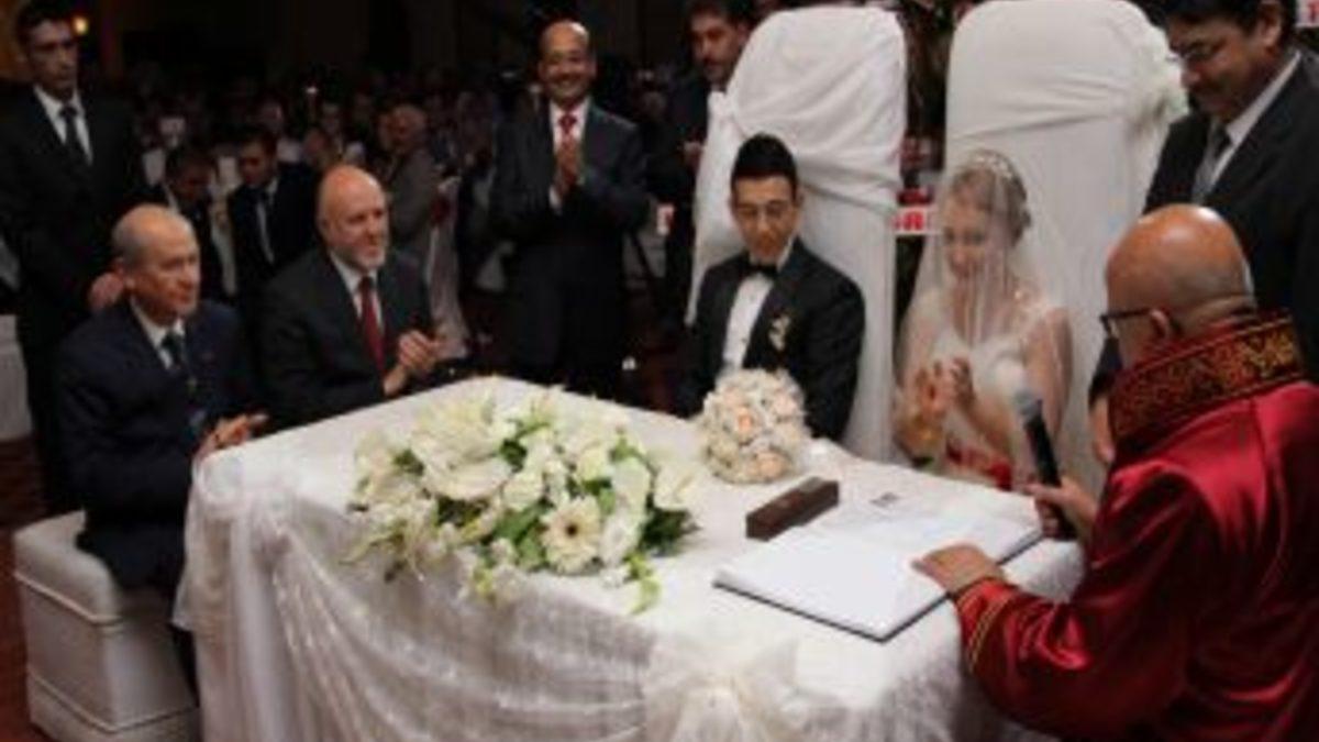 Milliyetçi Hareket Partisi (MHP) Genel Başkanı Devlet Bahçeli, partisinin Afyonkarahisar İl Başkanı Aziz Aslan’ın oğlunun düğün törenine katıldı. Oruçoğlu Termal Otel’de gerçekleştirilen düğün törenine katılan Bahçeli, dünya evine giren Merve Eda ve Mehmet Yasin çiftinin nikah şahitliğini yaptı. Bahçeli, otel kapısı önünde partililer tarafından karşılandı. Partililer, Bahçeli ile tokalaşmak için uzun kuyruk oluşturdu. Engelli Furkan Oruç ile sohbet eden Bahçeli, daha sonra düğünün yapıldığı salona geçti. Merve Eda ve Mehmet Yasin çiftinin nikahını Afyonkarahisar Belediye Başkanı Burhanettin Çoban kıydı. Çiftin nikah şahitliğini Bahçeli ve AK Partili İl Genel Meclis Başkanı Salih Sel yaptı. Kıyılan nikahın ardından çift, evlilik cüzdanını Bahçeli’nin elinden aldı. Çifte bir ömür boyu mutluluklar dileyen Bahçeli, düğün hediyesi olarak bilezik taktı. Düğü törenine AK Parti İl Başkanı Mehmet Zeybek, MHP’li ilçe ve belde belediye başkanları, partililer ve çok sayıda davetli katıldı.