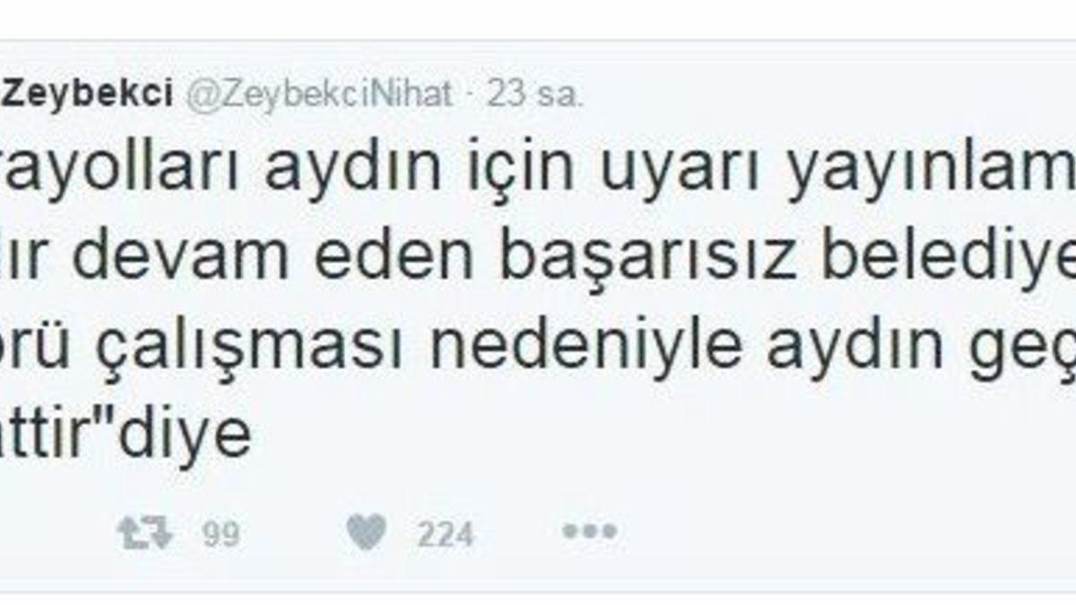 Ekonomi Bakanı Nihat Zeybekci, Aydın Büyükşehir Belediyesi tarafından inşa edilen ASTİM Köprülü Kavşağı inşaatının uzun sürmesine twitter hesabı üzerinden tepki gösterdi.Ekonomi Bakanı Nihat Zeybekci, Aydın Büyükşehir Belediyesi tarafından inşa edilen ASTİM Köprülü Kavşağı yapımının uzun sürmesi nedeniyle sosyal medya hesabı üzerinden tepki gösterdi. Bakan Zeybekci, twitter hesabından şunları paylaştı:“Karayolları Aydın için uyarı yayınlamalı’ 1 yıldır devam eden başarısız belediyenin köprü çalışması nedeniyle Aydın geçişi 1 saattir” diye tepki gösterdi.