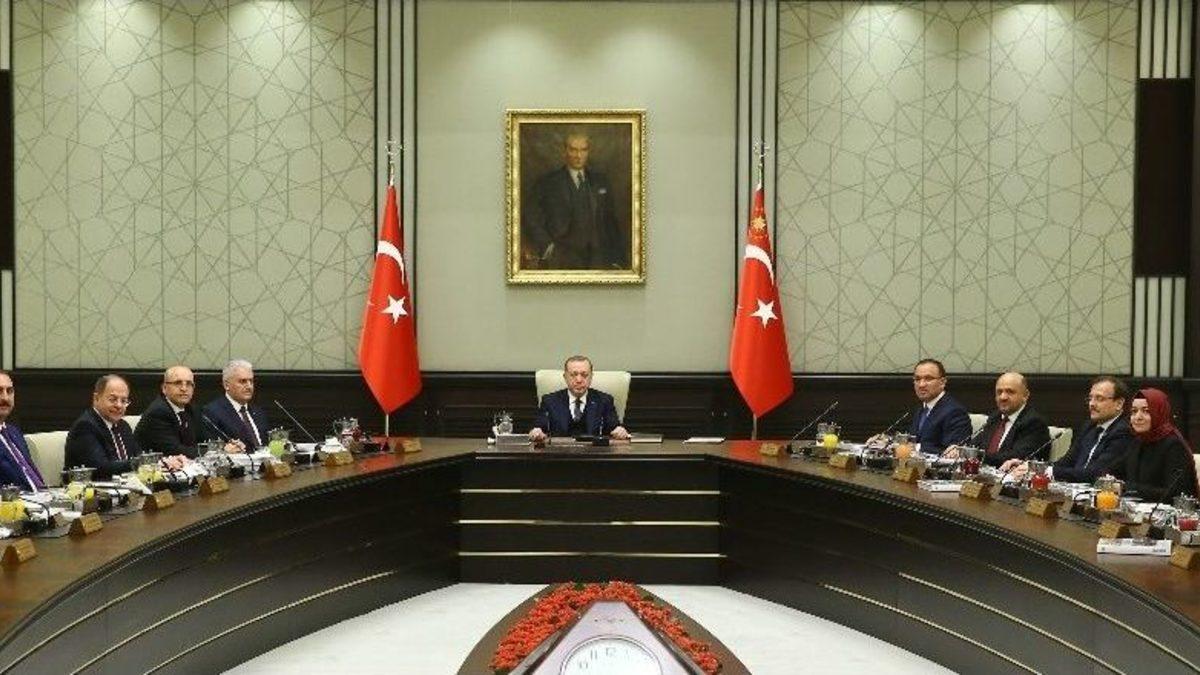 Bakanlar Kurulu, Cumhurbaşkanı Recep Tayyip Erdoğan başkanlığında toplandı.Bakanlar Kurulu, Cumhurbaşkanı Recep Tayyip Erdoğan başkanlığında Cumhurbaşkanlığı Külliyesi’nde toplandı. Masada OHAL’in uzatılmasına yönelik MGK’da ele alınan tavsiye kararı önemli başlık olacak. Terörle mücadele kapsamında sürdürülen operasyonlar başta olmak üzere Afrin’e olası operasyon da ele alınacak diğer konular arasında yer alıyor.