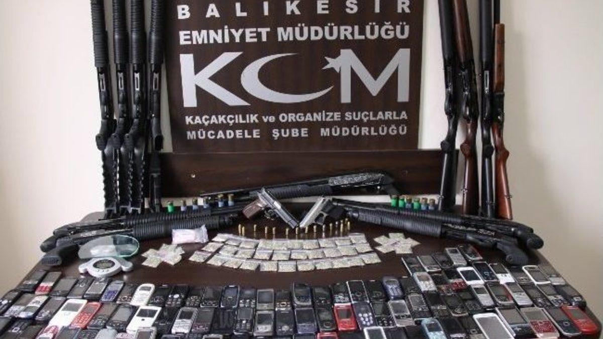 Balıkesir'de polisin düzenlediği operasyonda çok miktarda uyuşturucu, ruhsatsız silah, gümrük kaçağı sigara ve cep telefonu ele geçirildi.Balıkesir İl Emniyet Müdürlüğü'nden verilen bilgiye göre, Kaçakçılık ve Organize Suçla Mücadele Şubesi (KOM) tarafından uyuşturucu madde ve ruhsatsız silah sattıkları ayrıca gümrük kaçakçılığı yaptıkları tespit edilen 2 şüpheli hakkında yasal işlem yapıldı. Sokak satıcılığı da yaptığı iddiasıyla gözaltına alınan M.I. (55) ve İ.I. isimli baba-oğul şüpheliler tutuklanmaları talebiyle mahkemeye sevk edildi. Şahıslardan İ.I. tutuklanırken, babası M.I. ise tutuksuz yargılanmak üzere serbest bırakıldı.Yapılan aramalarda, 41 paket şeffaf poşet içerisinde satışa hazır vaziyette her biri yaklaşık 1.30 gram ağırlığında olan toplam 55.10 gram bonzai maddesi, uyuşturucu tartımında kullanılan hassas terazi, 35 adet uyuşturucu madde satışında kullanılan kilitli poşet, 939 paket değişik markalarda gümrük kaçağı sigara, 18 adet gümrük kaçağı cep telefonu, 3 adet sabit dipçikli otomatik, 4 adet seyyar dipçikli pompalı av tüfeği, 1 adet tek kırma, 5 adet dipçiksiz kabzeli pompalı av tüfeği olmak üzere toplam 13 adet av tüfeği ve 12 adet dolu fişek, 1 adet kama ve 1 adet pala, 2 adet ruhsatsız tabanca, 16 dolu mermi, 23 adet çeşitli çaplarda bıçak ve 9 adet muşta elde edildiği bildirildi.