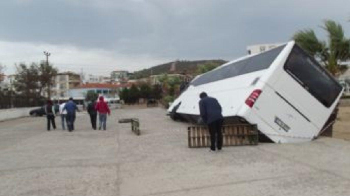 Balıkesir’in Ayvalık ilçesine bağlı Küçükköy beldesinde bir tur otobüsünün ağırlığına dayanamayan beton yol çöktü.
