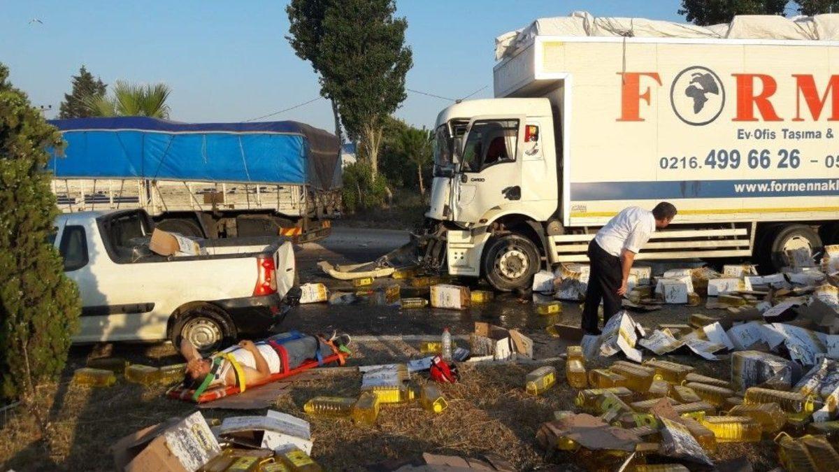 Balıkesir’de tır, otomobil ve otobüsün karıştığı zincirleme kazada ortalık adeta savaş alanına döndü.Kaza, Erdek-Bandırma karayolu üzerinde Düzler Mahallesi’nde bulunan trafik ışıklarında sabah saatlerinde meydana geldi. Edinilen bilgiye göre, 35 EAS 21 plakalı Hüseyin Çeşmeci yönetimindeki ayçiçek yağı yüklü tır, Düzler kavşağına geldiği sırada trafik ışıklarında bekleyen 10 AND 82 plakalı Bahattin Tunç yönetimindeki otomobile çarptı. Otomobili hurdaya çeviren tır, hızını alamayınca aracın önünde bekleyen kamyona da çarptı. Çarpmanın etkisiyle kamyon, yolcu otobüsü ve otomobillere çarpınca facia kaçılınmaz oldu. Kazaya karışan tırın devrilmesi sonucunda Düzler’de bulunan kavşak, adeta savaş alanına döndü.Kazanın ardından olay yerine 112 acil sağlık ekibi, Balıkesir Büyükşehir İtfaiyesi Daire Başkanlığına bağlı Erdek İtfaiye Grup Amirliği ile polis ekipleri intikal etti. Kazaya karışan tır şoförü Hüseyin Çeşmeci ve kamyon şoförü Şaban Doğan sıkıştıkları yerden itfaiye yardımıyla çıkarılarak ilk müdahaleleri sağlık ekiplerince yapıldıktan sonra hastaneye kaldırıldı. Diğer sürücüler ise kazayı yara almadan atlattı.Uzun bir süre trafiğe kapalı kalan Erdek-Bandırma karayolunda Erdek İtfaiye Grup Amirliğine bağlı ekipler tarafından temizleme çalışmaları yapıldı. Yol kontrollü bir şekilde trafiğe açıldı.Polis sürücülerin ifadesine başvururken, kazayla ilgili soruşturma devam ediyor.