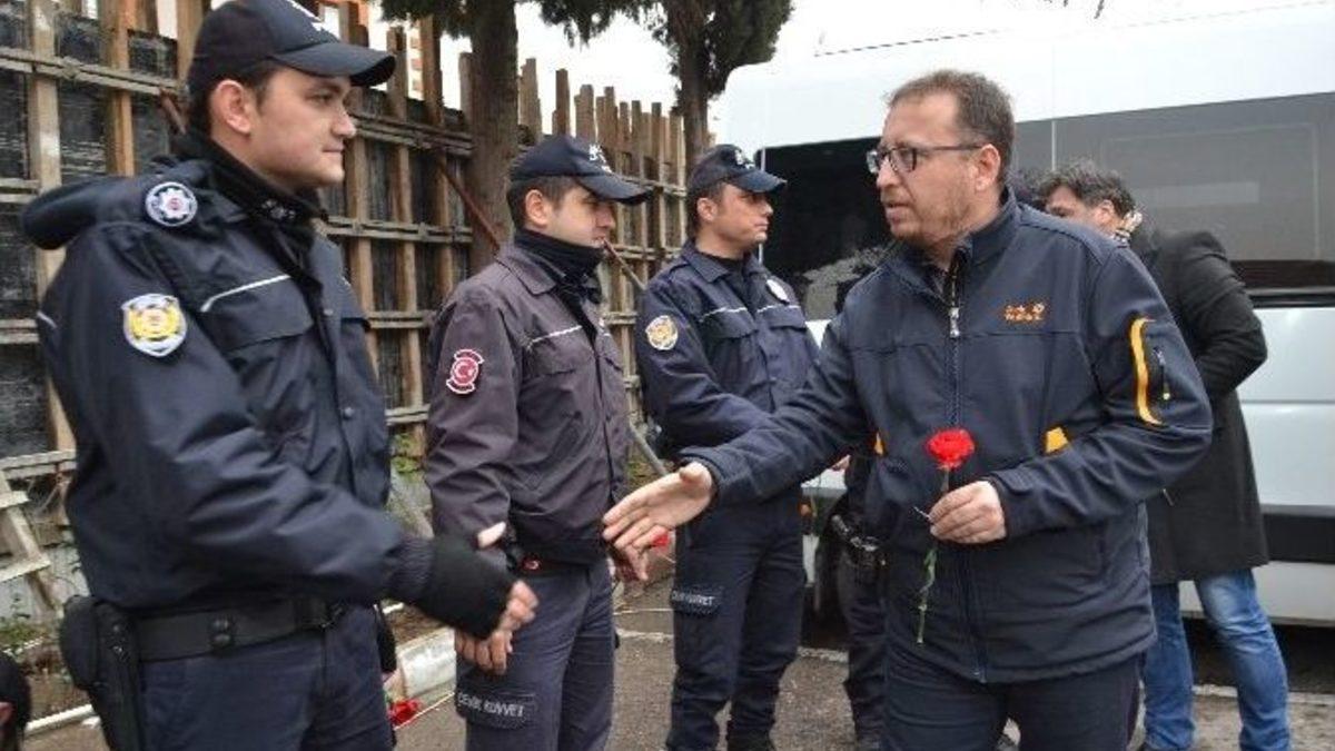 Balıkesirspor futbolcuları, yöneticiler, teknik ekip ile taraftarlar, Balıkesir Çevik Kuvvet Şube Müdürlüğün’deki polisleri ziyaret ederek, başsağlığı dileğinde bulundular.Balıkesirspor Kulüp Başkanı Feyyaz Çiftçi, yönetim kurulu üyeleri, teknik kadro, futbolcular ve taraftarlar Balıkesir Çevik Kuvvet Şube Müdürlüğü’nde görev yapan polisleri ziyaret etti. Başkan Feyyaz Çiftçi, Çevik Şube Müdürü Ömür Çelik’e İstanbul’da gerçekleşen hain saldırı sonrası hayatını kaybeden ve yaralanan polis memurları için baş sağlığı ve geçmiş olsun dileklerini iletti.Çiftçi: "Ülke olarak hepimiz üzüntü içerisindeyiz"Türkiye’nin yaşadığı bu zor dönemden Türk milleti olarak en kuvvetli şekilde çıkacağının altını çizen Çiftçi, sözlerini şöyle sürdürdü:"Balıkesirspor olarak polis arkadaşlarımızla uyum içinde çalışıyoruz. Onlar bizim kahrımızı çekiyorlar. Memleketimizin savunmasında, memleketimizin ayakta kalmasında büyük fedakarlıklarla görev yapıyorlar. Memleketimiz ve ülkemiz üzerinde oyunlar oynanıyor. En son meydana gelen elim terör olayının bir maç sonrası olması çok üzücü. Emniyet teşkilatında görevli polis mensubu arkadaşlarımız, bizim orada güven içinde futbol maçı oynamamız için fedakarca görev yapıyorlar. Hain bir saldırı sonrası şehit olup, gazi ediliyorlar. Ülke olarak hepimiz üzüntü içerisindeyiz. Başınız sağ olsun. Allah memleketimize ve size sabırlar versin. Allah size güç, kuvvet versin. Biz Balıkesirspor camiası olarak elimizden ne geliyorsa yapmak için arkanızdayız."Çevik Şube Müdürü Ömür Çelik ise Balıkesirspor Kulüp Başkanı Feyyaz Çiftçi’ye teşekkür ederek, "Her şey için sağ olun. Ayağınıza sağlık. İyi dilekleriniz ve iyi niyetleriniz için size teşekkür ediyoruz. Bizimle birlikte olduğunuzu göstermeniz çok önemli. Bu cümleleri kurmanız bizim için önemli. Tekrar tekrar teşekkür ediyoruz" şeklinde konuştu.Balıkesirspor kafilesi, çevik kuvvette görevli polislere karanfil vererek, Manisa’da gerçekleşecek olan Manisaspor-Balıkesirspor maçı için yola çıktılar.