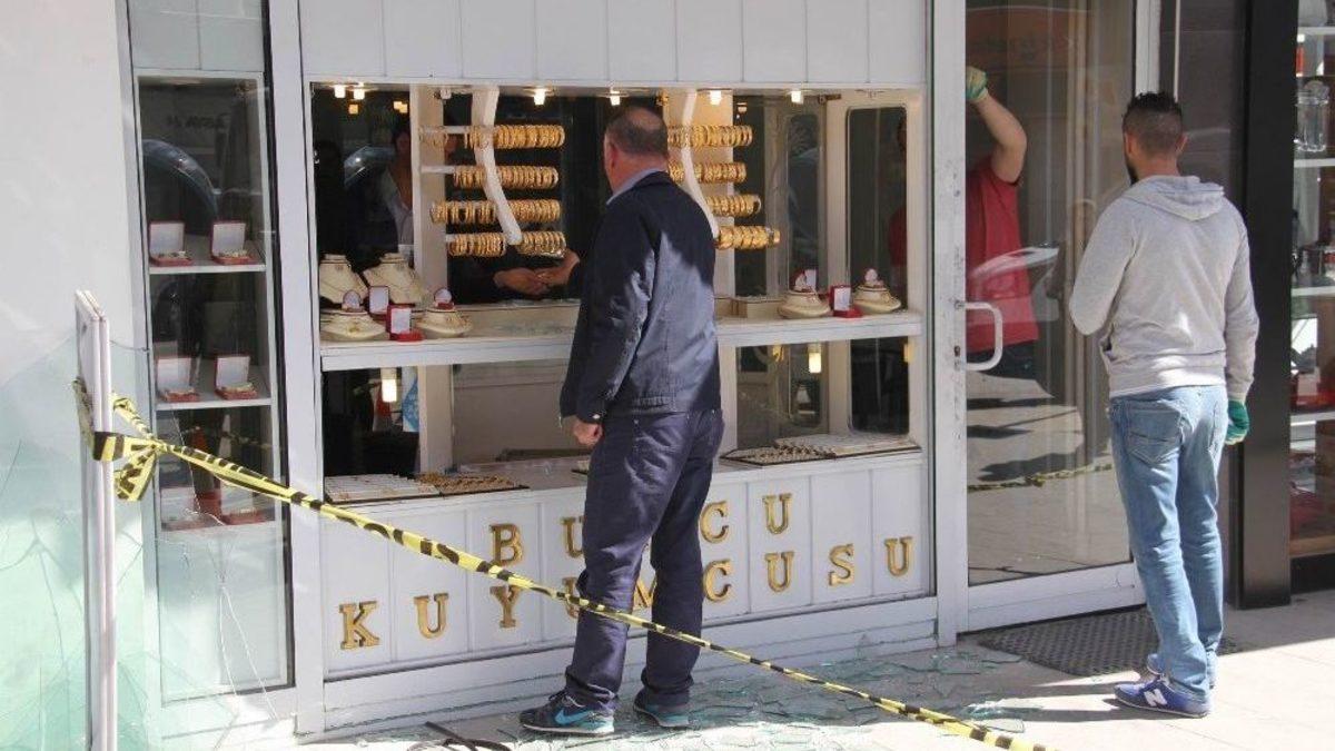 Erzincan’da baltayla kuyumcu dükkanını soymaya çalışan hırsızı vatandaşlar yakaladı. Şahıs polise teslim edilirken o anlar güvenlik kameralarına yansıdı.Olay, bugün Erzincan’da Fevzi Paşa Caddesi üzerinde meydana geldi. Motosikletiyle Fevzi Paşa Caddesi üzerinde bulunan kuyumcunun önüne gelen E.A. (28) bir süre çevreyi kontrol eden ettikten sonra getirdiği odun parçasını kuyumcudan kimsenin çıkmaması için dükkan kapısına sıkıştırdı. Ardından elindeki balta ile kuyumcunun camını kıran hırsız vitrinde bulunan 7 bileziği çalarak kaçmaya çalıştı. Çevredeki duyarlı vatandaşlar hırsızlık olayını görür görmez şahsı yakaladı.Olay yerine gelen Erzincan Emniyet Müdürlüğü Asayiş Şube Müdürlüğü ekipleri şahsı gözaltına aldı. Soygun anı ise iş yerinin güvenlik kameralarına saniye saniye yansıdı.