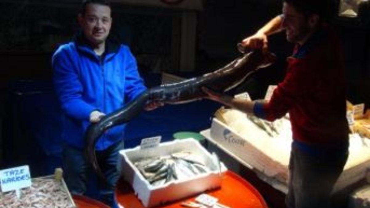 Denizlerin saldırgan balığı olarak bilinen müren, Kapıdağ’ın Kocaburgaz açıklarında avlandı. 2 metre boyundaki Müren Balığı, Bandırma'daki balıkçı tezgahında sergilendikten kısa bir süre sonra satıldı.