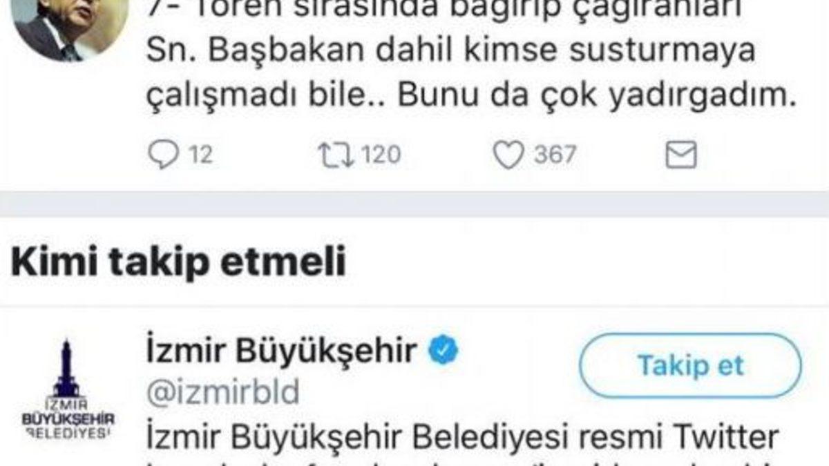 "Selçuk'taki İZBAN töreninde ve öncesinde neler yaşandığını sizlerle paylaşmak istiyorum. İZBAN'da yüzde 50 ortak olmamıza rağmen, Selçuk'taki töreni basından öğrendik. Program bize bugün, yani törenin yapıldığı 8 Eylül tarihinde ulaştı. Yani ortada bir gariplik olduğu belliydi. Ama biz bunu gündem yapıp, ortamı germek istemedik. Kürsüye çıktığımda bazı gruplar tarafından yuhalandım. 'İn aşağı' ve 'konuşma' gibi hakaretlere maruz kaldım. İzmir'in seçilmiş belediye başkanı olarak duruşumla, davranışımla böyle bir tavrı hak etmediğime inanıyorum. Tören sırasında bağırıp çağıranları Sayın Başbakan dahil kimse susturmaya çalışmadı bile. Bunu da çok yadırgadım. İzmir Enternasyonal Fuarı açılışında, Açıkhava Tiyatrosu'nda yaşananları herkes hatırlayacaktır. Zamanın Sanayi Bakanı Nihat Ergün'e protesto olunca, ben kürsüye fırlayıp herkesi susturmuş ve Sayın Bakan'dan özür dilemiştim. Devlet adamlığı, siyasetçilik budur; konuğuna, ortağına, devlet büyüğüne nasıl davranılacağını göstermektir."
