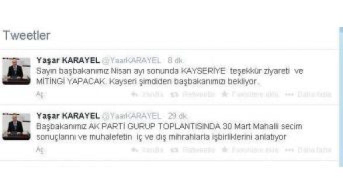 AK Parti Kayseri Milletvekili Yaşar Karayel, Başbakan Recep Tayyip Erdoğan’ın Nisan ayı sonunda Kayseri’ye teşekkür ziyareti yapacağını twitter hesabından duyurdu.AK Parti Kayseri Milletvekili Yaşar Karayel, twitter hesabından yaptığı duyuruda, “Sayın Başbakanımız Nisan ayı sonunda Kayseri’ye teşekkür ziyareti ve miting yapacak. Kayseri şimdiden Başbakanımızı bekliyor” yazdı.