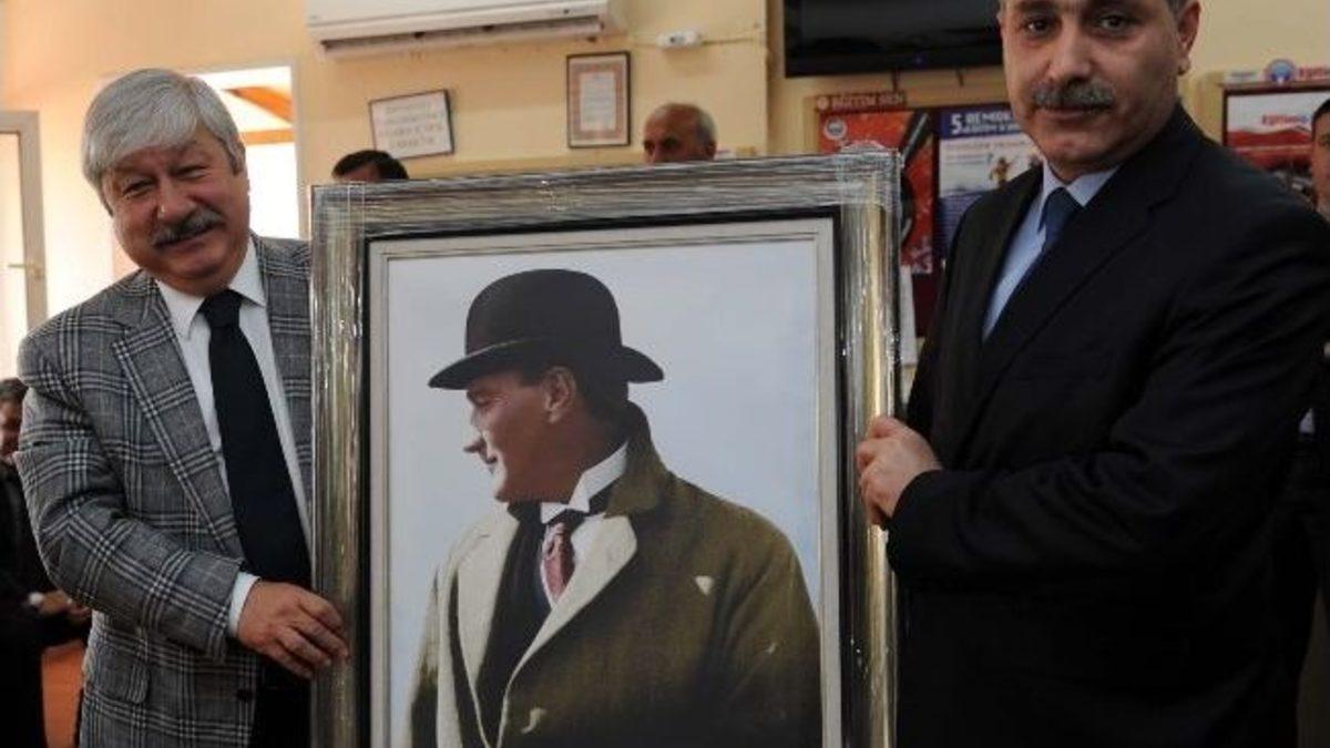 Okul Müdürü Metin Kınacı’ya Atatürk portresi hediye eden Başkan Mustafa Akaydın, okula da satranç takımı ve top hediye etti.