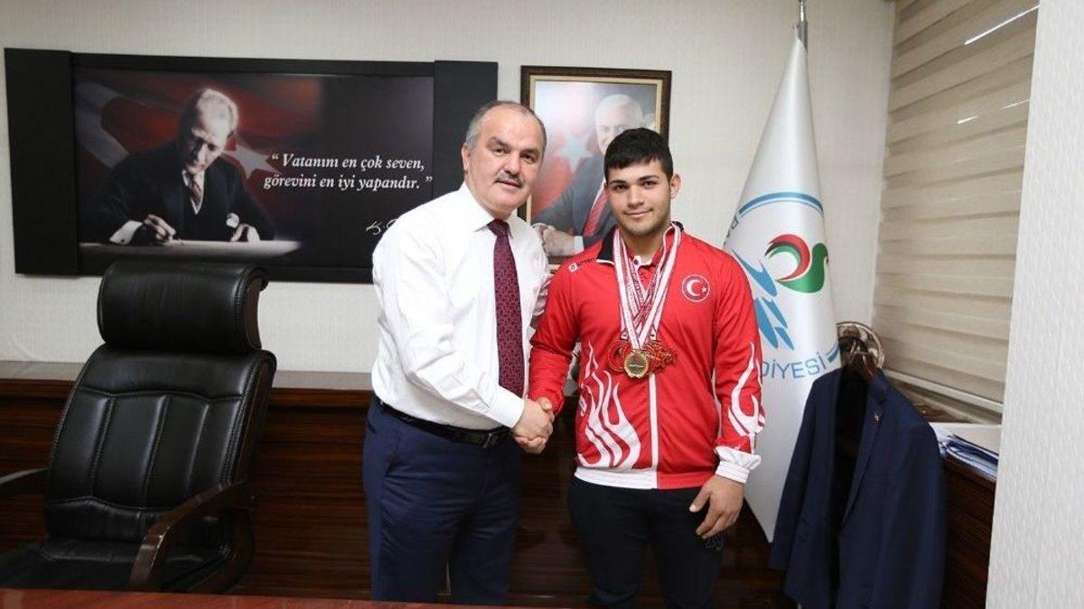 Pamukkale Belediye Başkanı Hüseyin Gürlesin, Okul Sporlarında Denizli’yi temsil ederek Türkiye Şampiyonu olan Anafartalar Mesleki ve Teknik Anadolu Lisesi heyetini ağırladı.Pamukkale Belediye Başkanı Hüseyin Gürlesin, Amasya’da düzenlenen Okul Sporları Halter Türkiye Şampiyonası’nda Türkiye Şampiyonu olan Anafartalar Mesleki ve Teknik Anadolu Lisesi öğrencisi Mehmet Avcıl, okul müdürü Asım Gülhan ile Beden Eğitimi Öğretmeni, Halter Milli Takım Antrenörü Ferhat Coşkun’u konuk etti.3 yıldır milli sporcu olan 17 yaşındaki Mehmet Avcıl’ın 6 Türkiye Şampiyonluğu, 1 Avrupa Yıldızlar Şampiyonluğu ve Tayland’da düzenlenen Dünya Yıldızlar Şampiyonasında Dünya sekizinciliği bulunuyor.2017 yılında Adana’daki Türkiye Şampiyonası’nda Yıldızlar, Gençler ve Büyükler kategorilerinde Türkiye şampiyonu olan Mehmet Avcıl, Amasya’da düzenlenen Okul Sporları Halter Türkiye Şampiyonası’nda Türkiye Şampiyonu oldu.Hedefinin 2020 Tokyo Olimpiyatlarında Türk Bayrağını dalgalandır olduğunu belirten Avcıl, maddi manevi desteğini esirgemeyenlere teşekkür etti.Pamukkale Belediye Başkanı Hüseyin Gürlesin, ziyaretten duyduğu memnuniyeti dile getirerek, “Mehmet Avcıl evladımızı öncelikle tebrik ediyorum. 3 yıl önce başlamış olduğu bu spor dalında başarıdan başarıya koşmakta. Kısa zamanda bu kadar güzel başarılar elde etmek herkese nasip olmaz. Evladımız, azmin elinden hiç birşeyin kurtulmadığının ispatıdır. Halterde bu başarısını uzun vadede çok daha iyi yerlere taşıyacağına eminim. Bundan dolayı kendisine moral motivasyon olması anlamında destek verdik” dedi.