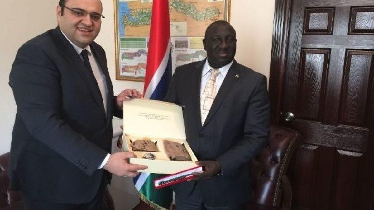 Gambiya’nın Ankara Büyükelçisi Momodou Badjie ile Ankara’da bir araya gelen Aziziye Belediyesi Başkanı Muhammed Cevdet Orhan, kardeşlik köprüsü kurdu. Turizm ve tarım ülkesi olan Gambiya’nin bir şehri ile Aziziye ‘kardeş şehir’ olacak.Erzurum’un Aziziye ilçesinden, Afrika ülkesi Gambiya’ya kardeşlik ve turizm köprüsü kuruluyor. Aziziye Belediye Başkanı Muhammed Cevdet Orhan, Gambiya Büyükelçisi Momodou Badjie ve Büyükelçi Müsteşarı Sering Modou Njie ile bir araya geldi. Gambiya’nın Ankara Büyükelçiliği’nde yapılan görüşmede turizm ve kardeşlik köprüsü kurulması için ilk adımlar atıldı. Önümüzdeki günlerde Aziziye ile Gambiya’nın bir şehri arasında kardeşlik protokolü imzalanacak.Aziziye Belediye Başkanı Muhammed Cevdet Orhan, nüfusunun yüzde 90’ı müslüman olan, geçim kaynağı turizm, tarım ve hayvancılığa dayanan Afrika ülkesinin aynı zamanda liman kenti Gambiya ile kurulacak kardeşlik köprüsünün her iki ülke için de önemli bir kazanım olacağını söyledi.ERZURUM AFRİKA PAZARINA ACILACAKGambiya’nın Afrika kıtasında yaklaşık 2 milyon nüfusuyla küçük bir ülke olduğunu hatırlatan Başkan Orhan, “Bu küçük Afrika ülkesinin Türkiye sevgisi oldukça büyük. 1965 yılında bağımsızlığını ilan eden Gambiya ile ülkemiz arasında karşılıklı olarak 2011 yılında büyükelçilikler açılmış ve bu sayede ilişkiler zirve yapmıştır. Gambiya aynı zamanda 15 üye ülke ve 300 milyon nüfusa hitap eden Afrika Devletleri Ekonomik Topluluğu’nun da üyesi. Bu kardeşlik adımıyla ikili ilişkilerin gelişmesi yanında, Afrika Pazarı ile Erzurum’daki yatırımcı ve müteşebbislerin buluşmasına vesile olacaktır.” dedi.MAYIS AYINDA ERZURUM’A GELECEKLERMayıs ayında Gambiya Büyükelçisi Momodou Badjie ile beraberindeki bir heyetin de Erzurum’a geleceğini kaydeden Başkan Orhan, bu ziyarette Erzurum ve Aziziye’deki yatırım alanlarını gezdirerek, kapsamlı bir sunum yapacaklarını belirtti. Kurulacak olan turizm ve kardeşlik köprüsünü çok önemsediğinin altını çizen Başkan Orhan, “Erzurum’da da hemşehrilerimizle, işadamı ve bürokrasiyle bu kardeşlik bağının gelişmesi noktasında istişareler gerçekleştireceğiz. Başta turizm bağımız olmak üzere, kardeşlik damarlarımızı sağlam tutmak adına çalışmalar yapacağız. Mayıs ayında ağırlayacağımız heyetin ardından biz iade-i ziyaret gerçekleştirerek, değerlerimizi, kültürümüzü tanıtma ve tanıma fırsatı yakalayacağız.” ifadelerini kullandı.Başkan Orhan, popülaritesi her geçen gün yükselen Gambiya’nın 2017 yılında Dünya İslam Konferansı Örgütü’ne de ev sahipliği yapacağını sözlerine ekledi.TÜRKİYE SEVDALISI BİR ÜLKEGambiya Cumhuriyeti Ankara Büyükelçisi Momodou Badjie de, Başkan Orhan’a nazik ziyaretinden dolayı teşekkür etti. Kardeşlik bağlarının güçlenmesi adına atılan adımları çok önemsediklerini ifade eden Badjie, ‘Kardeş şehir’ projelerinden büyük mutluluk duyduğunu kaydetti.Gambiya’nın Türkiye sevdalısı bir ülke olduğunu ifade eden Badjie, kardeşlik köprüleriyle her iki ülke halklarının kopmaz bağlarla birbirine bağlandığını, Gambiya’da Türkiye sevgisinin daha da pekiştiğini belirtti. Çok güzel ve tertemiz denize sahip olan ülkenin, Avrupalı turistler tarafından da tercih edildiğinin altını çizen Badjie, bu kardeşlik adımının her iki ülke turizminin de gelişmesine katkı sunacağını kaydetti.Oldukça samimi bir atmosferde gerçekleşen görüşme sonunda Başkan Orhan, Büyükelçi Badjie’ye Oltu Taşı tesbih, yöresel ehram kıyafetinden üretilmiş ürünler seti ile belediyenin kültür yayınları arasında yer alan eserlerden hediye etti. Badjie de Başkan Orhan’a Gambiya’yı tanıtan bir kitap hediye ederek uğurladı.