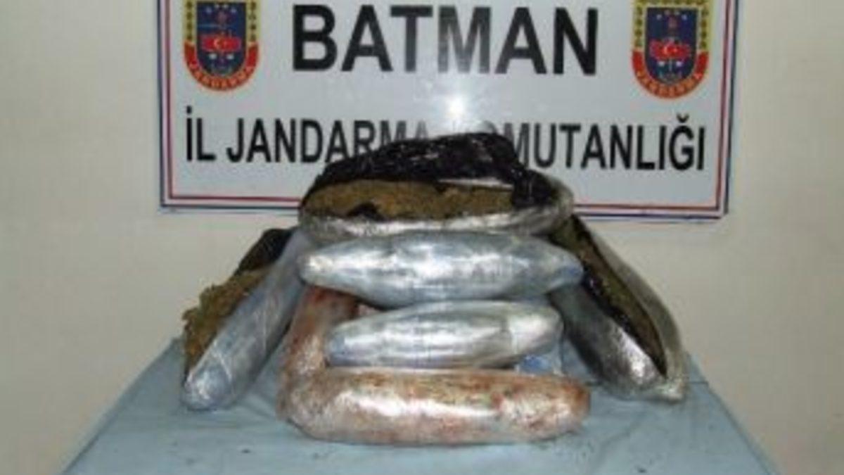Batman'da jandarma ekiplerince yapılan yol kontrollerinde 15 kilo 250 gram kubar esrar maddesi ele geçirildi.Batman İl Jandarma Komutanlığı ekiplerince yapılan çalışmalar neticesinde Diyarbakır'ın Bismil ilçesinden Batman’a uyuşturucu madde getirileceği istihbaratı üzerine harekete geçen jandarma ekipleri, Diktepe köyü mevkisinde M.E yönetimindeki aracı durdurdu. Ekipler durdurdukları aracın bagaj kısmında yaptıkları aramada poşetlere sarılı toplam 15 kilo 250 gram kubar esrar maddesi ele geçirdi. Ele geçirilen esrar maddesi muhafaza altına alınırken, M.E isimli şahıs gözaltına altına alındı.