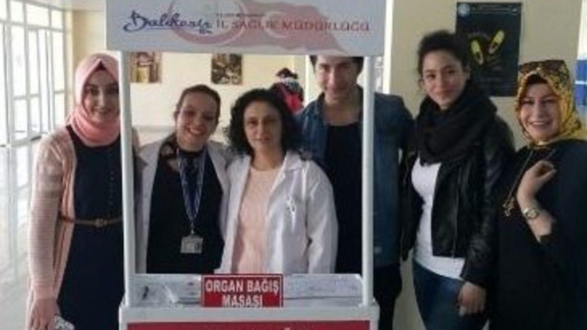 Balıkesir Devlet Hastanesi Organ Nakil Koordinatörlüğü "Geleceğe Umut Ol" projesi kapsamında organ bağışında farkındalık oluşturmak amacıyla BAÜN Kampüs yemekhanesinde stant açtı.Balıkesir Devlet Hastanesi Organ Nakil Koordinatörlüğü Geleceğe Umut Ol projesi kapsamında BAÜN Kampüs yemekhanesinde stant açtı. Balıkesir Devlet Hastanesi Organ Doku Nakil Koordinatörlüğünde görevli Hemşire Emine Dursun Ekinci yaptığı açıklamada "BAÜN Tıp Fakültesi ile birlikte ortaklaşa düzenlediğimiz " Geleceğe Umut Ol" projesi kapsamında organ bağışında farkındalık oluşturmak ve organ bağışı almak için stant açtık. Burada bize Üniversite Hemşirelik Yüksek Okulundaki gönüllü öğrencilerimiz destek verdiler. Stantta toplam 144 organ bağışı topladık. Ben bu konuda tüm öğrenci ve vatandaşlarımızı duyarlı olmaya davet ediyorum. Başka projelerde el ele olmak ümidiyle, bir organ bir hayat demektir" dedi.