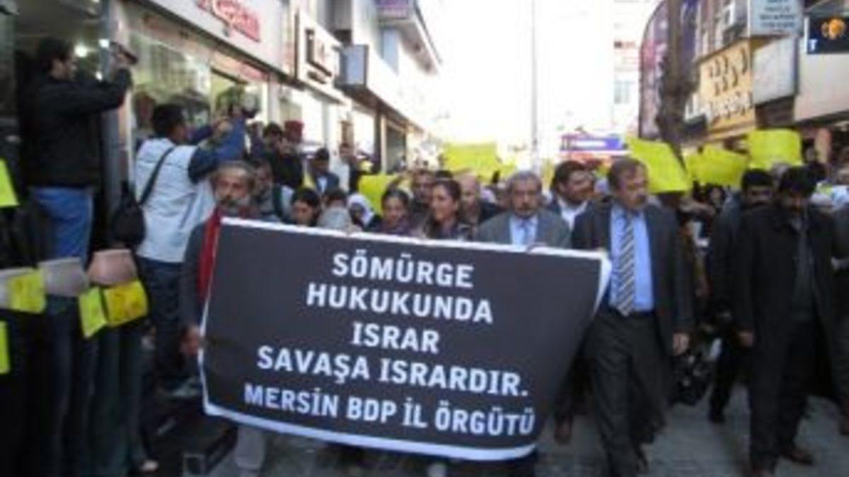 Mersin'de BDP'li bir grup, tutuklu bulunan BDP'li milletvekillerinin tahliye talebinin reddedilmesini protesto etti.Silifke Caddesi üzerindeki BDP Mersin İl Başkanlığı önünde toplanan ve aralarında Akdeniz Belediye Başkanı Fazıl Türk'ün de bulunduğu grup, Atatürk Caddesi üzerindeki Mersin Büyükşehir Belediye binası önüne kadar yürüdü.Burada konuşan Akdeniz Belediye Başkanı Fazıl Türk, aynı şekilde tutuklu bulunan CHP İzmir Milletvekili Mustafa Balbay'ın tahliye edilip, BDP'li milletvekillerinin tahliye talebinin reddedilmesini çifte standart olarak değerlendirdi.BDP İl Başkanı Halis Değer ise, Diyarbakır 5 ve 6. Ağır Ceza Mahkemelerinin, BDP'li tutuklu vekillerin tahliye talebini oy çokluğu ile reddettiğini hatırlatarak, bu durumun Kürtlere yönelik inkar politikalarının devamı olduğunu ileri sürdü. Bu kararın hukuki değil siyasi olduğunu savunan Değer, "Açıkça belirtmeliyiz ki, bu karar bir hukuk skandalıdır, bir çifte standarttır. İstanbul'da ayrı Diyarbakır'da ayrı bir hukuk işlemektedir" dedi. Değer ayrıca, özel yetkili mahkemelerin kaldırılmasını ve tutuklu milletvekillerinin serbest bırakılmasını istedi.Grup, basın açıklamasının ardından 10 dakika oturma eylemi yaparak dağıldı.