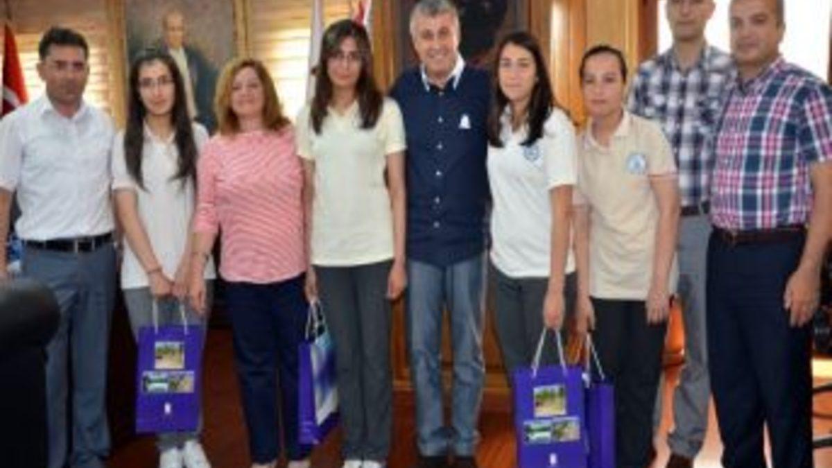 Yarışmada lise kategorisinde birinci olan Manavgat Lisesi’nden Betül Altıner ve dereceye giren öğrenciler Buse Yıldız,...