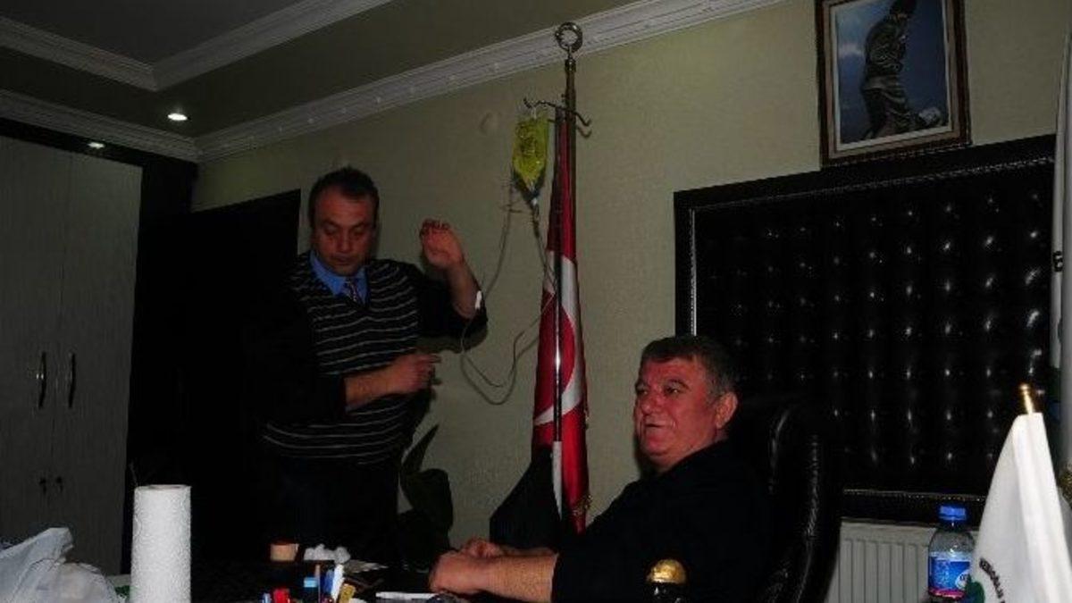 Nebioğlu Belediye Başkanı Ertan Aydoğan, makamında belediye meclis üyeleriyle yaptığı toplantıda aniden fenalaştı. Tansiyonu düşen başkana ilk müdahalenin ardından serum takıldı.Toplantıda bulunan AK Parti Nebioğlu Belde Başkanı Mustafa Kemal Ertuğrul, gazetecilere yaptığı açıklamada, Başkan Aydoğan’ın gribal hastalığa yakalandığını ve tedavi gördüğünü söyledi. Yaşanan olayın sadece tansiyon düşüklüğünden kaynaklandığını ifade eden Ertuğrul, "Başkanımız birkaç gündür gribal hastalığa yakalandı tedavisi sürüyor. Ancak, belde de işler yoğun olduğundan rapor almadı. Şuan için de yaşanan olay tansiyon düşüklüğünden kaynaklanmaktadır" diye konuştu.Aydoğan’a ilk müdahalenin ardından serum takıldı.