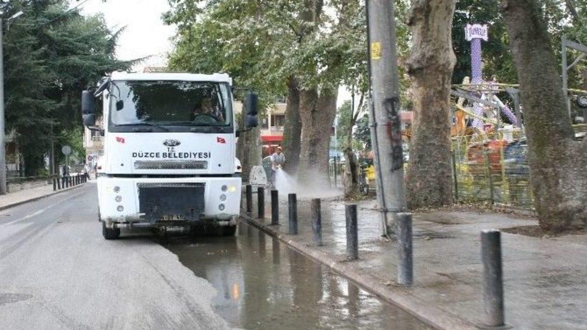 Düzce Belediyesine bağlı temizlik ekipleri kaldırımları tazyikli su ile yıkıyor.Düzce Belediyesi ekipleri kentin dört bir...