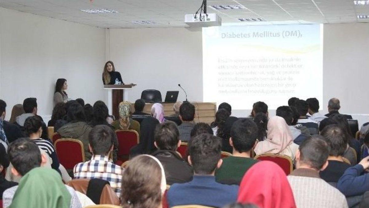 Bitlis Eren Üniversitesi (BEÜ) Sağlık Yüksekokulu Beslenme ve Diyetetik Kulübü tarafından 14 Kasım Dünya Diyabet Günü kapsamında farkındalık konferansı düzenlendi.Sağlık Yüksekokulu Beslenme ve Diyetetik Kulübü öğrencileri, 14 Kasım Dünya Diyabet Günü kapsamında “Günümüzde Sıkça Rastlanan Diyabet (Şeker Hastalığı) ve Tıbbi Beslenme Tedavisinde Yeni Yaklaşımlar” konulu konferans düzenledi. Öğretim görevlisi Esma Aksoy Kendilci’nin önderliğinde Adnan Menderes Üniversitesi Uygulama ve Araştırma Hastanesi Beslenme ve Diyet Uzmanı Didem Güneş’in konuk olduğu programa Sağlık Yüksekokulu Müdürü Prof. Dr. Ahmet Beyarslan, Beslenme ve Diyetetik Bölüm Başkanı Yrd. Doç. Dr. Aziz Aksoy, yüksekokulu personeli ve çok sayıda öğrenci katıldı.Diyetisyen Didem Güneş’in, “Diyabette Tıbbi Beslenme Tedavisi, Diyabette Genel Öneriler, Karbonhidrat Sayımı ve Diyabet Kampları” konulu sunumlarının ardından katılımcılara şeker hastalığı ve beslenme broşürü ile yeşil elma ve mandalina dağıtıldı.Ayrıca programa katılan öğrencilere “Tip 1 Diyabet’te Tıbbi Beslenme Tedavisi ve Karbonhidrat Sayımı” konferansı katılım belgesi verildi.Program, Yüksekokul Müdürü Prof. Dr. Ahmet Beyarslan’ın Diyetisyen Didem Güneş’e teşekkür belgesi ve çeşitli hediyeler takdim etmesiyle son buldu.