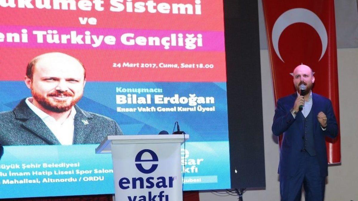 Türkiye Gençlik Vakfı (TÜGVA) Yüksek İstişare Kurulu Üyesi Bilal Erdoğan, “16 Nisan, Türkiye’nin geleceğinin bağımsızlık anlayışı üzerinde inşa edilmesine karar verileceği bir gün olacaktır” dedi.TÜGVA Yüksek İstişare Kurulu Üyesi Bilal Erdoğan, Ordu Büyükşehir Belediyesi Anadolu İmam Hatip Lisesi Konferans Salonu’nda düzenlenen Ensar Vakfı’nın programına katıldı. Programda bir konuşma yapan Bilal Erdoğan, salonda bulunan gençlere seslenerek, “Yeniden büyük Türkiye, yeni Türkiye inşallah siz gençlerin omuzlarında yükselecektir. O yüzden hedeflerimizi büyük tutacağız. O yüzden yeni Türkiye dediğimiz, büyük Türkiye dediğimiz ülke, sizin hedeflerinizin büyüklüğü ile büyüyecektir. Çünkü bu ülkeyi yükseltecek sizlersiniz” diye konuştu.16 Nisan’da yapılacak referanduma değinen Bilal Erdoğan, bu tarihin Türkiye Cumhuriyeti açısından en önemli tarihlerden biri olduğunu ifade etti. Erdoğan, “16 Nisan’da sadece yeni anayasayı oylamayacağız. 16 Nisan’da ülkemizin, çocuklarımızın geleceğini, vatanımızın beka meselesinde geleceğimizin bağımsızlık anlayışı üzerinde inşa edilmesine karar vereceğiz. Şimdi mahkeme salonlarında her türlü rezilliği yapan, her türlü yalanları söyleyen o acizler var ya, onların iplerini kim tutuyorsa, o sahipleri, Tayyip Erdoğan ve iktidarını silip yeniden kendi oyunlarına, kendi planlarına, hizmet edecek kişilerin gelmesi üzerine planlar kurdular. Ama 14 yıldır bu büyük devrim, yeni ülkenin kuruluşunda bu aldığımız mesafe var. Bunların devam etmesi için 16 Nisan çok önemli” şeklinde konuştu.Konferansa başta AK Parti Ordu Milletvekilleri Oktay Çanak, Metin Gündoğdu, Ordu Valisi İrfan Balkanlıoğlu, Ordu Cumhuriyet Başsavcısı Ahmet Çiçekli, Ordu Büyükşehir Belediye Başkanı Enver Yılmaz, Altınordu Belediye Başkanı Engin Tekintaş, daire müdürleri, Ensar Vakfı yöneticileri ve kalabalık bir topluluk katıldı.