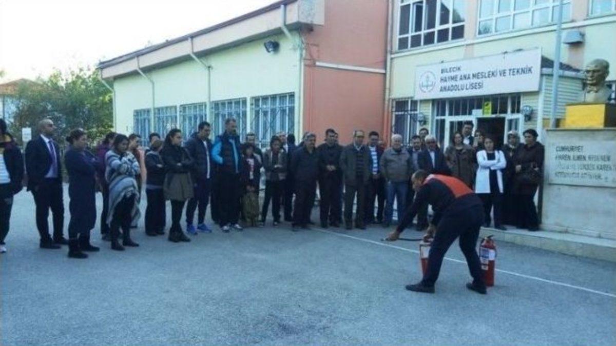 Bilecik Merkez Hayme Ana Mesleki ve Teknik Anadolu Lisesi’nde, ‘Acil Durum Eylem Planı’ çerçevesinde belirtilen koruma, kurtarma ve yangın söndürme ekiplerinde görev alanlara, eğitim verildi.Eğitim, Bilecik İş Sağlığı ve Güvenliği İl Koordinatörü Mustafa Çağlar tarafından verildi. Kurs kapsamında yangın söndürmeye ilişkin teorik bilgilerin verilmesinden sonra uygulama bölümünü oluşturan tatbikatlar da gerçekleştirildi. Tatbikat bölümlerinde AFAD ekiplerinden destek alındı. Böylece teorik bilgilerin daha kalıcı şekilde öğrenilmesi sağlandı. Kursun tamamlanmasının ardından bilgiler veren Bilecik İş Sağlığı ve Güvenliği İl Koordinatörü Mustafa Çağlar, “Çok yararlı bir kurs süreci geçirdik. Okul ve kurumlarımızda koruma, kurtarma ve yangın söndürme ekiplerinde görev alan arkadaşlarımıza yangına müdahale konusunda hayati önem taşıyan bilgi ve beceriler kazandırdık. Yangın gibi durumların hayatta hiç beklemediğimiz bir anda birdenbire karşımıza çıkan durumlar olur. Yangın esnasında panik yapmadan bilinçli bir şekilde önceden hazırlanıldığı gibi organize olarak harekete geçmek gerekir. Bu can ve mal kaybını en aza indirir. Bu yüzden, her kurum bünyesinde bu eğitimlerin en azından belirli bir görevli kitlesine verilmesi çok önemlidir” ifadelerini kullandı.