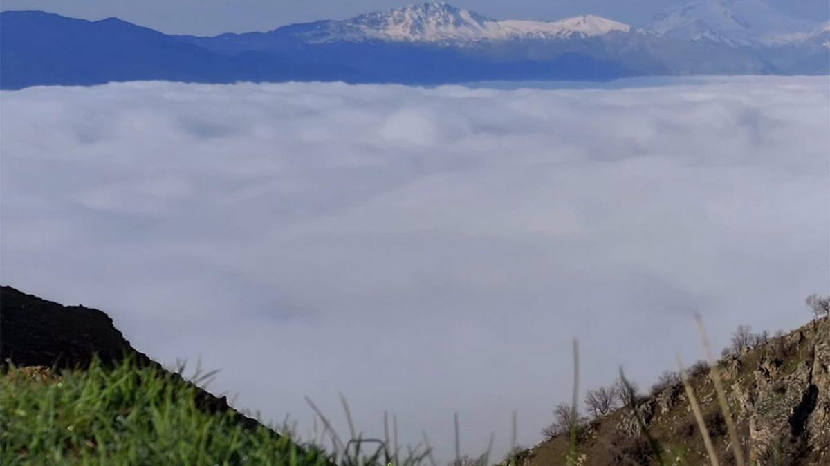 Çüngüş ilçesinde sağanak yağmurlardan sonra oluşan sis, Elyos Mahallesi'ni tamamen kapladı. O anlar mahalle sakini Bayram Güldalı tarafından, cep telefonu kamerası ile kaydedildi.