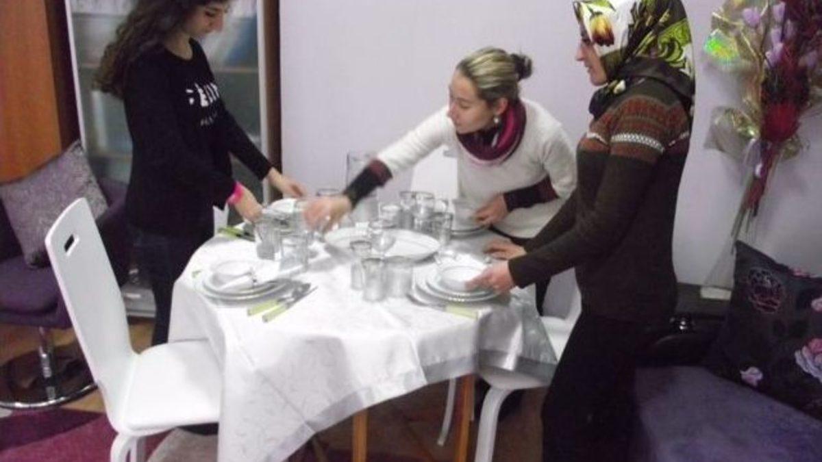 Erzurum Girişimci Kadınlar Derneği Kalkınma Bakanlığı SODES Proje sinden desteklenen Turizm Sektörüne ara eleman yetiştirme projesinin uygulamalı derslerinde kursiyerler birbirlerini ağırladılar.Kısa adı ER-KADIN olan derneğin “Keşke Turizm de İşimiz Olsa-Bir Turistik Gezimiz Olsa” isimli kadın istihdamını amaçlayan projesi nin uygulamalı dersleri oldukça neşeli geçiyor. Kursiyerler yaptıkları yemekleri veya çay saati için hazırladıkları yiyecekleri eğitim salonunda yer alan uygulama köşesinde birbirlerine servis ederek hem derslerini yapıyor hem de eğlenerek öğreniyorlar.Proje de Garson, komi, kat hizmetlisi olarak yetiştirilen kursiyerler, ders programının bitiminde son ay uygulamalı olarak otel ve restoranlarda da staj yapacaklar.Dernek başkanı Zekiye Çomaklı “ İlimiz de Turizm oldukça yeni sayılabilecek bir iş sahası. İnsanımız özellikle kadınlarımız bu sektörde çalışmaya çekiniyorlar. Kadınlarımız da erkeklerimiz de turizm sektöründe ara elaman olarak çalışabilecek nitelikte eğitimli değiller. SODES tarafından desteklenen bu proje de 15 kadın eğitim alıyor ve ER_KADIN derneği ara eleman sıkıntısı için eğitimli eleman yetiştirmenin gururunu yaşıyor. Allah devletimizden ve emeği geçen herkesten razı olsun.” dedi.