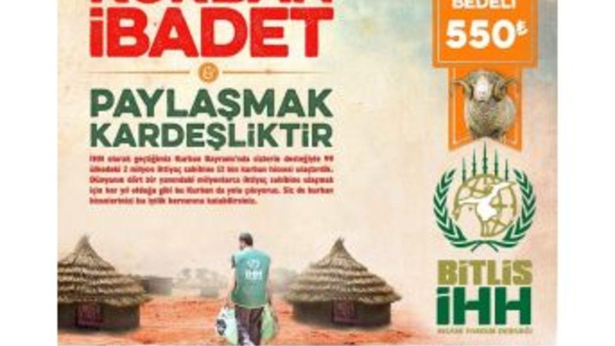 Bitlis İnsani Yardım Derneği (İHH), bu yılki kurban bağışlarını İHH’nın kurban organizasyonu ile yurt içi ile birlikte 89 ülke ve bölgede ihtiyaç sahiplerine ulaştıracak.24 yıldır kurban organizasyonu gerçekleştiren İHH’nın bu bayramda ihtiyaç sahiplerini unutmadığını belirten Bitlis İHH Derneği Başkanı Muzaffer Taşcan, vekâlet yoluyla kurbanlarını İHH’ya bağışlamak isteyen hayırseverlerin, kurban çalışmaları için belirlenen ülkeler arasında dilediğinde kurbanını kestirip ihtiyaç sahiplerine ulaştırabileceğini söyledi. İnsani Yardım Vakfı’nın 2016 yılı kurban çalışması kapsamında Türkiye ile birlikte 89 ülke ve bölgede kurban bağışlarını sahiplerine ulaştıracaklarını ifade eden Taşcan, “İnsani Yardım Vakfı bu yılki Kurban organizasyonunu yurt içindeki Kurban çalışmaları ile birlikte 99 ülke ve bölgede geçekleştirecek. 24 yıldır kurban organizasyonu gerçekleştiren İHH’nın bu bayram belirlemiş olduğu kurban bedeli 550 TL. Vekâlet yoluyla kurbanlarını İHH’ya bağışlamak isteyen hayırseverler, kurban çalışmaları için belirlenen ülkeler arasında dilediğinde kurbanını kestirip ihtiyaç sahiplerine ulaştıracak. İHH, bir kurban bedelinin 550 TL olarak belirlendiği kampanya kapsamında kurban bağışları yapılabilecektir” dedi.Kurbanlar nasıl kesiliyor?Kurbanlıkların kesimiyle ilgili de bilgi veren Muzaffer Taşcan, “İHH, 2016 yılı kurban çalışması kapsamında Türkiye ile birlikte 89 ülke ve bölgede kurban bağışlarını sahiplerine ulaştıracak. Bu sene de kurban vesilesiyle yeryüzüne dağılacak İHH ekipleri, kendilerini dört gözle bekleyen kardeşlerine sadece kurban eti götürerek değil, aynı zamanda hayat koşullarını iyileştirmeye yönelik çeşitli projelerle de destek olmaya devam edecek. Cami ve mescitlerin, su kuyularının, eğitim merkezlerinin, meslek edindirme kurslarının, yetimhane binalarının ve benzeri birçok projenin temelleri de kurban ziyaretlerinde atılacak. Kurbanlıklar İHH görevlilerince kesim yapılacak ülke ve bölgelerde kurban olma özelliklerine uygun olarak satın alınır. Kurbanlıklar İslami usullere uygun olarak kesilir. Kesilen kurbanlar ihtiyaç sahiplerine elden dağıtılır. Kurban kesimlerinin gerçekleştiğine dair bilgi, kısa mesaj ile vekâlet sahiplerine iletilir. İHH, Afrika’dan Balkanlar ve Güneydoğu Asya’ya Ortadoğu’dan Latin Amerika’ya beş kıtada ihtiyaç sahiplerine ve yetimlere ulaşacak” diye konuştu.Kurbanlarınızı nasıl bağışlayabilirsiniz?Bitlis’ten kurban bağışında bulunmak isteyenlerin izlemesi gereken yol ile ilgilide bilgi veren Taşcan, “Derneğimiz vasıtasıyla kurban bağışında bulunmak isteyen hayırseverler Tatvan Belediyesi’nin arkasında bulunan dernek binamıza başvurarak, yada Kuveyt Türk Bankasının Tatvan Şubesindeki TR05 0020 5000 0131 3131 300001 İBAN nolu derneğimize ait olan hesap numarasına bir kurban bedeli olan 550 TL’yi yatırarak bağışta bulunabilirler. Ayrıca kurban bağışıyla ilgili bilgi almak isteyenler derneğimizi 0434 827 20 10 nolu numaradan arayarak detaylı bilgi alabilirler” dedi.