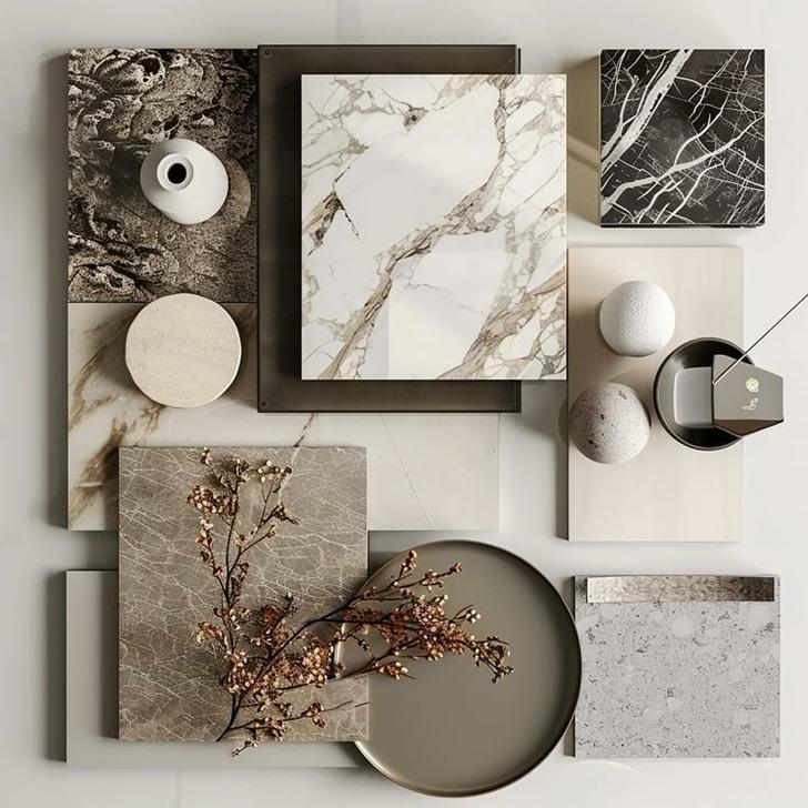 Mermer, kadife, metal gibi malzemeler.