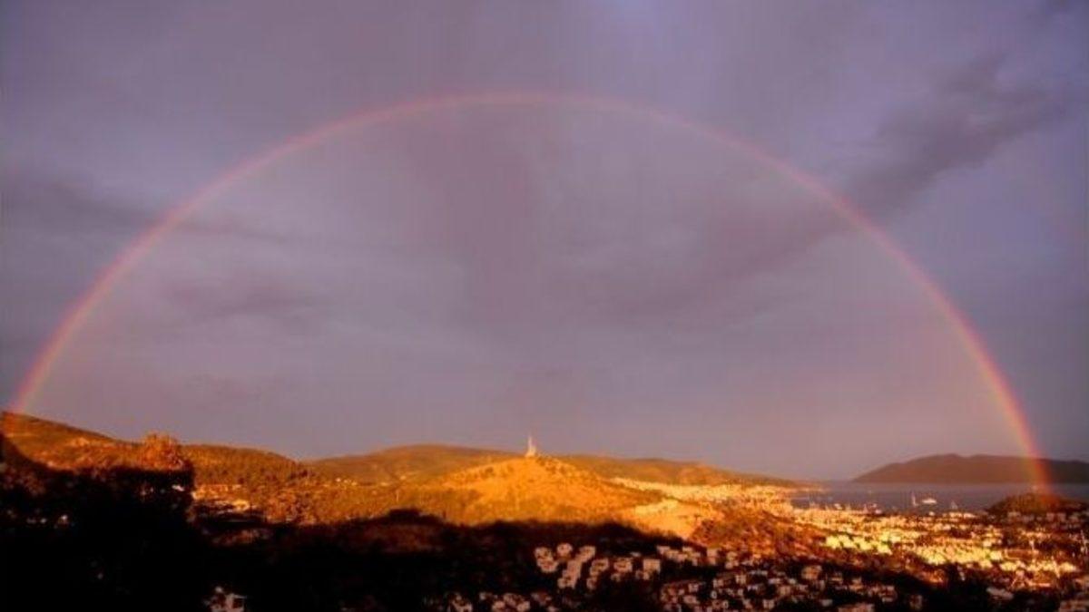 Muğla’nın Bodrum ilçesinde akşamüstü çıkan gökkuşağı görenleri büyüledi.Muğla ve çevresinde iki gündür aralıklarla devam eden yağışlı hava Bodrum’a uğramazken, akşamüstü kapanan havayla birlikte hafif yağan yağmur sonrası güneşin açması çok net gözüken bir gökkuşağı oluşturdu.Gökkuşağını gören yerli ve yabancı turistlerde bu eşsiz manzarayı fotoğraf makinaları ve cep telefonlarıyla ölümsüzleştirdiler. Bodrumlu vatandaşlarda çektikleri fotoğrafları anında sosyal medyada paylaştı. Paylaştıkları fotoğrafların üzerine ‘ İşte Bodrum’un güzellikleri’, ‘Bodrum’da yaşamak böyle bir şey’, ‘Bodrum ve muhteşem gökkuşağımız’ şeklinde yazılar yazdılar.Öte yandan meteoroloji yetkililerinden alınan bilgiye göre, Muğla ve çevresindeki yağışların iki gün boyunca aralıklarla devam edeceği öğrenildi.
