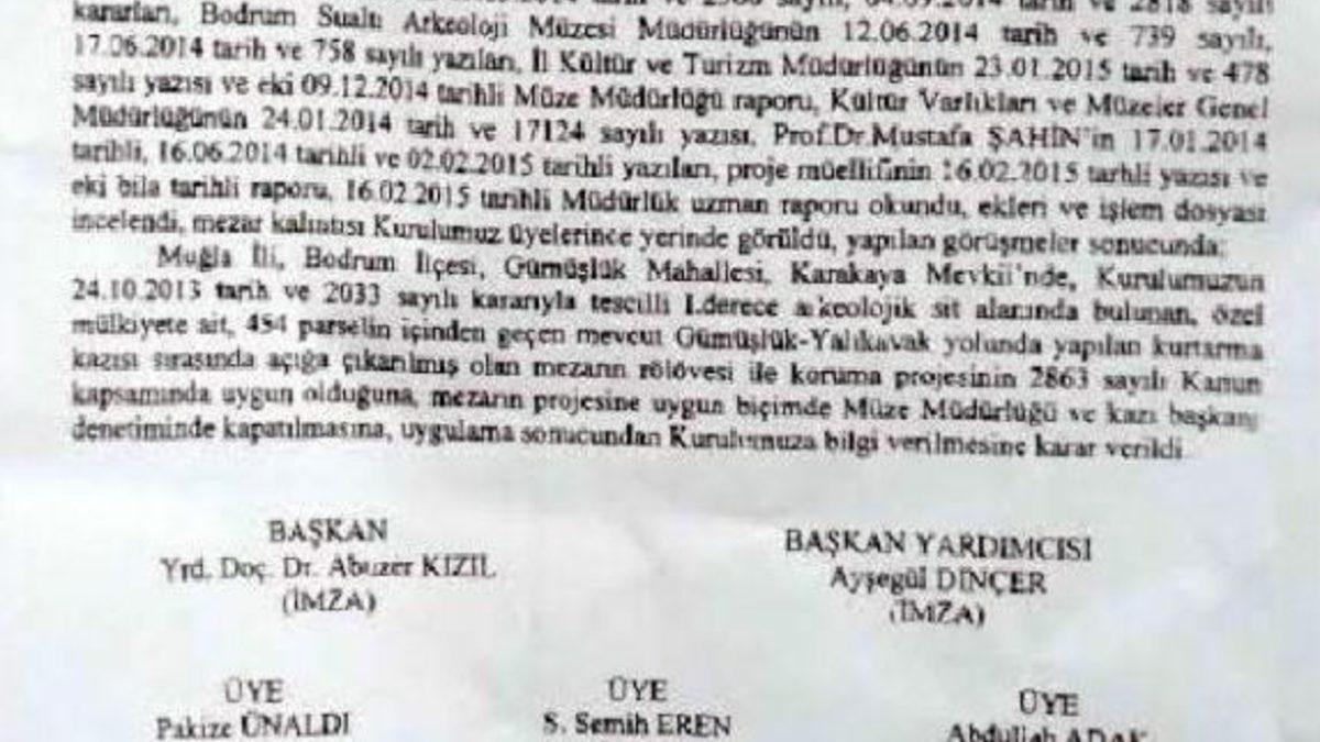 Raporda başkan, başkan yardımcısı, 5 üye, Muğla Büyükşehir Belediyesi temsilcisi, Bodrum Belediyesi temsilcisi ve Bodrum Sualtı Arkeoloji Müzesi Müdürü imzaları ile karara bağlanmıştır. Aynı kurul, mezarın kapatılması esnasında kazı başkanının ve müze müdürünün bulunmasını talep etmiştir. Müze müdürümüz alınan karar doğrultusunda, sizin bahsettiğiniz şekilde keyfiyetle değil, mevzuata göre hareket etmiştir."