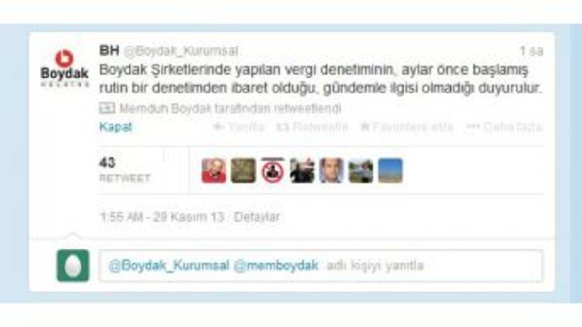 Boydak Holding, kurum adına açılan Twitter hesabından Boydak şirketlerine yönelik yapılan vergi denetimleri hakkında açıklama yaptı. Denetimin aylar önce başladığı duyuruldu. Boydak Kurumsal Twitter hesabından yapılan açıklamada, Maliye Bakanlığı’nın vergi denetimleriyle ilgili şu ifade yer aldı: "Boydak şirketlerinde yapılan vergi denetiminin, aylar önce başlamış rutin bir denetimden ibaret olduğu, gündemle ilgisi olmadığı duyurulur.