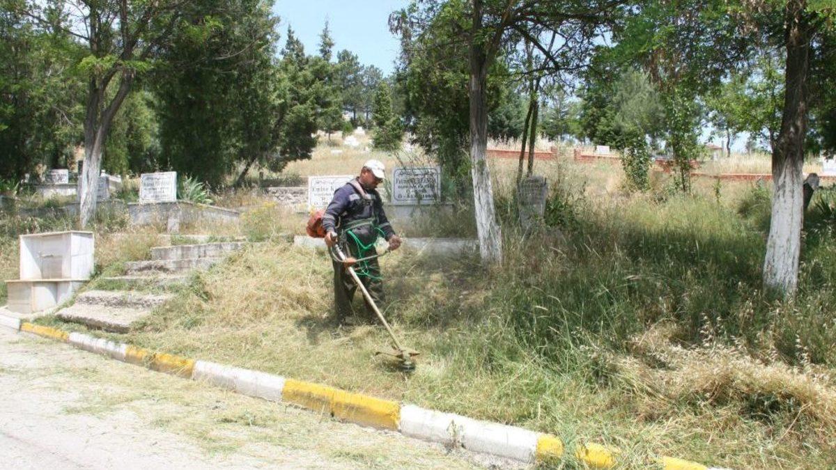 Bilecik'in Bozüyük Belediyesi tarafından Saraycık Caddesi üzerinde bulunan ilçe mezarlığında genel temizlik çalışmaları ile birlikte kuruyan otların biçimi ve temizliği yapılıyor.