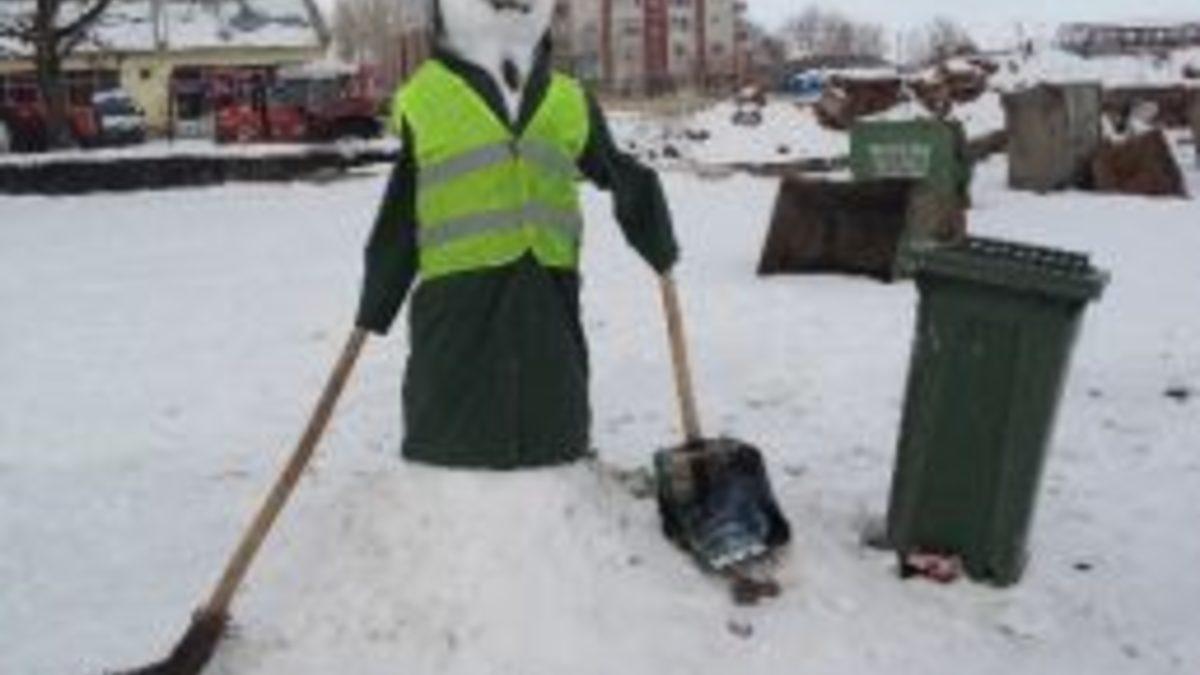 Elinde süpürgesi, küreği ve üzerinde kıyafeti gören vatandaşlar çöpçü kardan adamı hayranlıkla izlediler.