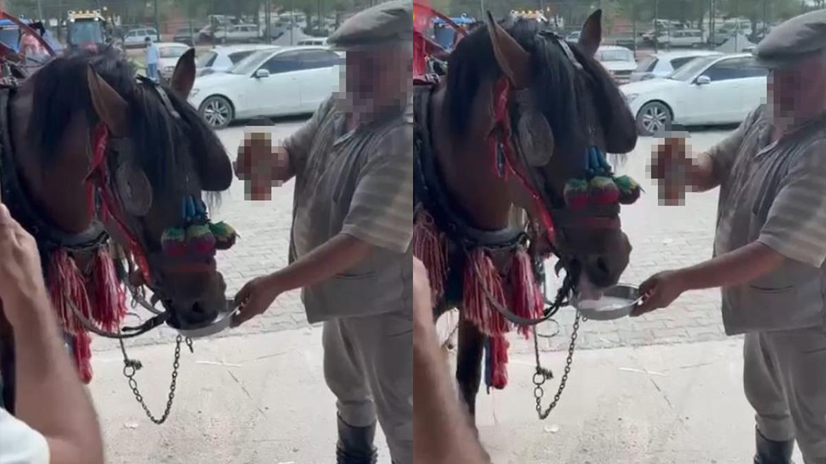 Tepki çeken olayın görüntüleri kameralara bu şekilde yansırken, zavallı atın alkol bağımlısı yapıldığı görüldü.
