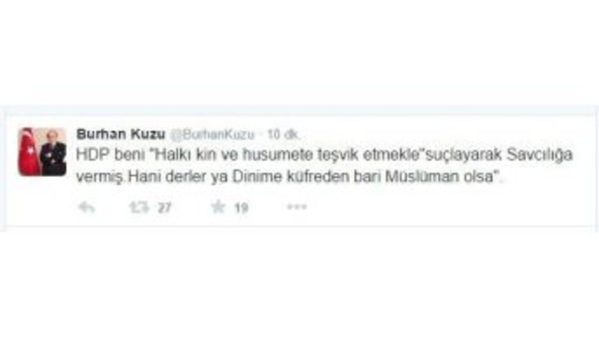 Cumhurbaşkanı Başdanışmanı Burhan Kuzu, Twitter hesabının engellenmesi için Nöbetçi Sulh Ceza Hakimliğine başvuran HDP’ye Twitter hesabından cevap verdi.HDP’nin kendisini ’Halkı kin ve düşmanlığa tahrik etmek’ suçundan savcılığa verdiğini söyleyen Burhan Kuzu, Twitter hesabından, "HDP beni ’Halkı kin ve husumete teşvik etmekle’ suçlayarak Savcılığa vermiş. Hani derler ya dinime küfreden bari Müslüman olsa" diyerek cevap verdi.