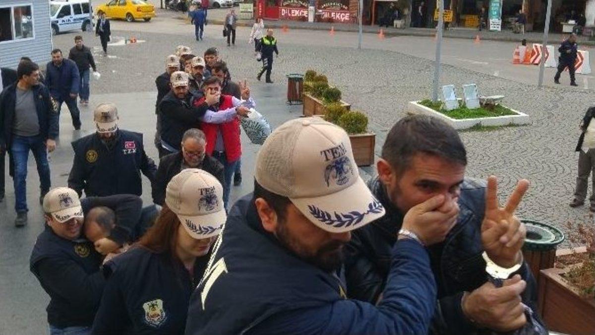 Bursa’da terör örgütü operasyonu kapsamında gözaltına alınan aralarında HDP, DBP, ESP merkez ilçe başkanlarının da aralarında bulunduğu 29 kişiden 15’i adliyeye sevk edildi. Zanlılar adliyeye girerken slogan atınca polis müdahale etti.Bursa Emniyet Müdürlüğü Terörle Mücadele Şube Müdürlüğü ekipleri, savcılığın izniyle 3 gün önce operasyon yaptı. Operasyonda 3 merkez ilçe başkanı, 2 avukat toplam 29 kişi gözaltına alındı. Terör örgütü üyeliği suçlamasıyla gözaltına alınan şüphelilerden 15’i bugün adliyeye sevk edildi. Terör zanlıları adliyeye girerken slogan atınca polis müdahale etti.