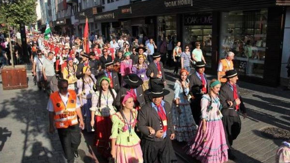 Etkinlikler, Atatürk Caddesi Atatürk Heykeli önünde toplanan aralarında yabancı ülkeden gelen halk dansları topluluklarında bulunduğu davetlilerin, güvercin uçurması ile başladı. Topluluk daha sonra 2 kilometre uzaklıktaki Zafer Plaza'ya kadar yürüdü. Kortej yürüyüşünde, yabancı halk dansları topluluğu üyelerinin halkı selamlaması alkışlarla karşılandı.