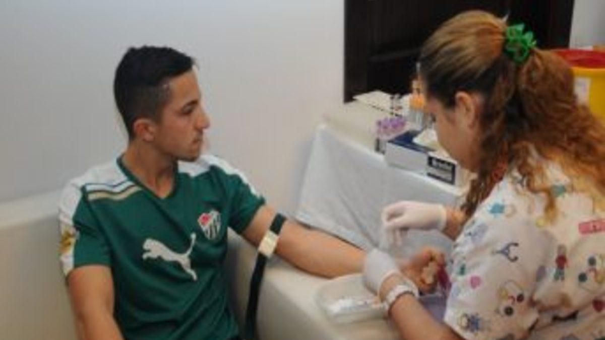 Bu arada, Bursasporlu futbolcular antrenman öncesi kan verdi. Acıbadem Hastanesi görevlileri tarafından sağlık testi yapmak üzere futbolculardan 9'ar tüp kan aldı.