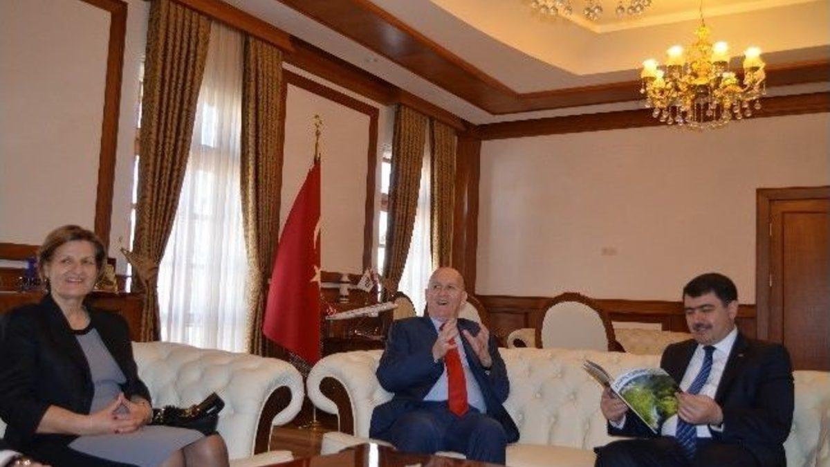 Malatya Tarım Fuarı için Malatya’ya gelen büyükelçiler ve yabancı misyon temsilcileri, Vali Vasip Şahin’i ziyaret etti.Malatya Tarım Fuarı için gelen Arnavutluk Büyükelçiliği Müsteşarı Saimir Kurtİ, Endonezya Ankara Büyükelçisi Nahari Agustini, Karadağ Ankara Büyükelçisi Ramo Bralic, Makedonya Ankara Büyükelçisi Goran Taskovskİ, Sri Lanka Demokratik Sosyalist Cumhuriyeti Ankara Büyükelçisi Bharathi Davina Wijeratne, Vali Vasip Şahin’i makamında ziyaret ederek bir süre görüştü.Vali Şahin, büyükelçileri her zaman Malatya’da görmek istediklerini belirterek; ilişkileri, ticari, sportif ve kültürel etkinliklerle daha da geliştirilebileceğini kaydetti. Vali Şahin, konuklarına Malatya’nın ekonomik, kültürel ve sosyal zenginlikleri hakkında bilgiler aktardı.Vali Şahin, konuklarına kayısı ile birlikte Malatya ile ilgili tanıtım broşür ve kataloglarını hediye etti. Büyükelçi ve yabancı misyon temsilcileri ise Vali Şahin’e ülkelerini tanıtıcı kataloglar ile birlikte çeşitli hediyeler sundu.
