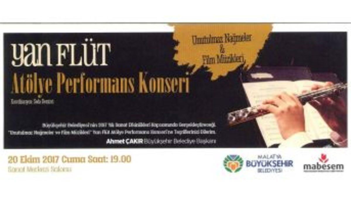 Malatya Büyükşehir Belediyesinin 2017 yılı kültürel etkinlikleri kapsamanda "Unutulmaz Nağmeler ve Film Müzikleri" isimli yan flüt konseri gerçekleştirilecek.Seda Demirci’nin koordinasyonuyla düzenlenecek olan Unutulmaz Nağmeler ve Film Müzikleri yan flüt konseri, 20 Ekim Cuma günü saat 19.00’da Şehit İbrahim Tanrıverdi Sanat Sokağında bulunan Sanat Merkezi salonunda sunulacak.Yan Flüt kursuna katılan kursiyerler tarafından sunulacak olan konseri vatandaşlar ücretsiz dinleyebilecek.