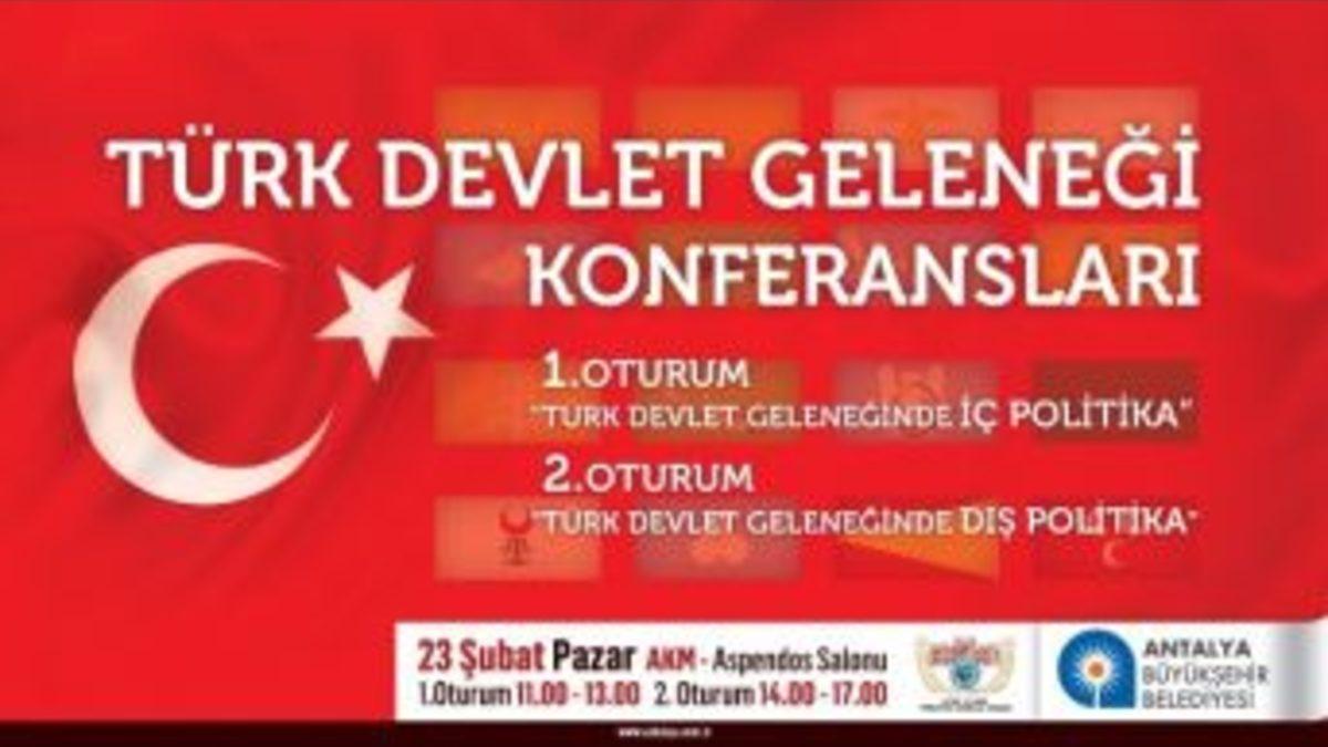 Antalya Büyükşehir Belediyesi, Türk devlet yapısının dünden bugüne geldiği durum hakkında Antalyalıları bilgilendirmek amacıyla 23 Şubat tarihinde “Türk Devlet Geleneği Konferansı” düzenleyecek.Antalya Büyükşehir Belediyesi Kültür ve Sosyal İşler Dairesi Başkanlığı ile Türk Ocakları Antalya Şubesi’nin ortaklaşa düzenlediği “Türk Devlet Geleneği Konferansı”, Antalya Kültür Merkezi (AKM) Aspendos Salonu’nda gerçekleştirilecek.İki oturum halinde gerçekleştirilecek konferansın ilk oturumda eski bakanlardan Abdüllatif Şener, Ulaştırma eski Bakanı Prof. Dr. Enis Öksüz, Doç, Dr. Necdet Ekinci, Yargıtay Onursal Cumhuriyet Başsavcısı Vural Savaş, ikinci oturumda ise Devlet eski Bakanı Prof. Dr. Abdulhaluk Çakmak, Prof. Dr. Gökhan Çapoğlu, Prof. Dr. Haydar Çakmak ve Devlet eski Bakanı Namık Kemal Zeybek konuşmacı olarak katılacak.