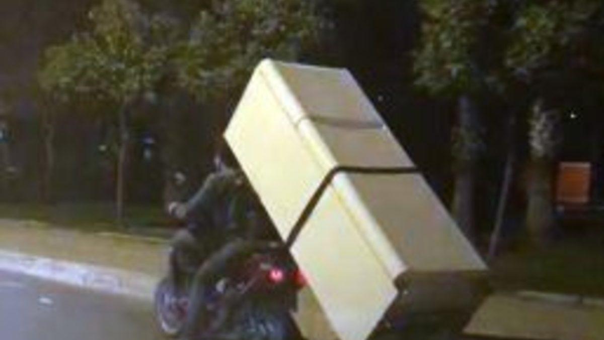 Adana’da bir motosikletli yük taşıma arabasına koyduğu buzdolabını, arkasındaki yolcunun sırtına yükleyerek seyretti.Adana’da akşam saatlerinde yük taşıma arabasına bağlanan buzdolabını 2 kişi motosikletle taşımaya kalkınca ortaya ilginç görüntüler çıktı. Yolda seyreden bir vatandaş tarafından kaydedilen görüntüler ’pes’ dedirtti.